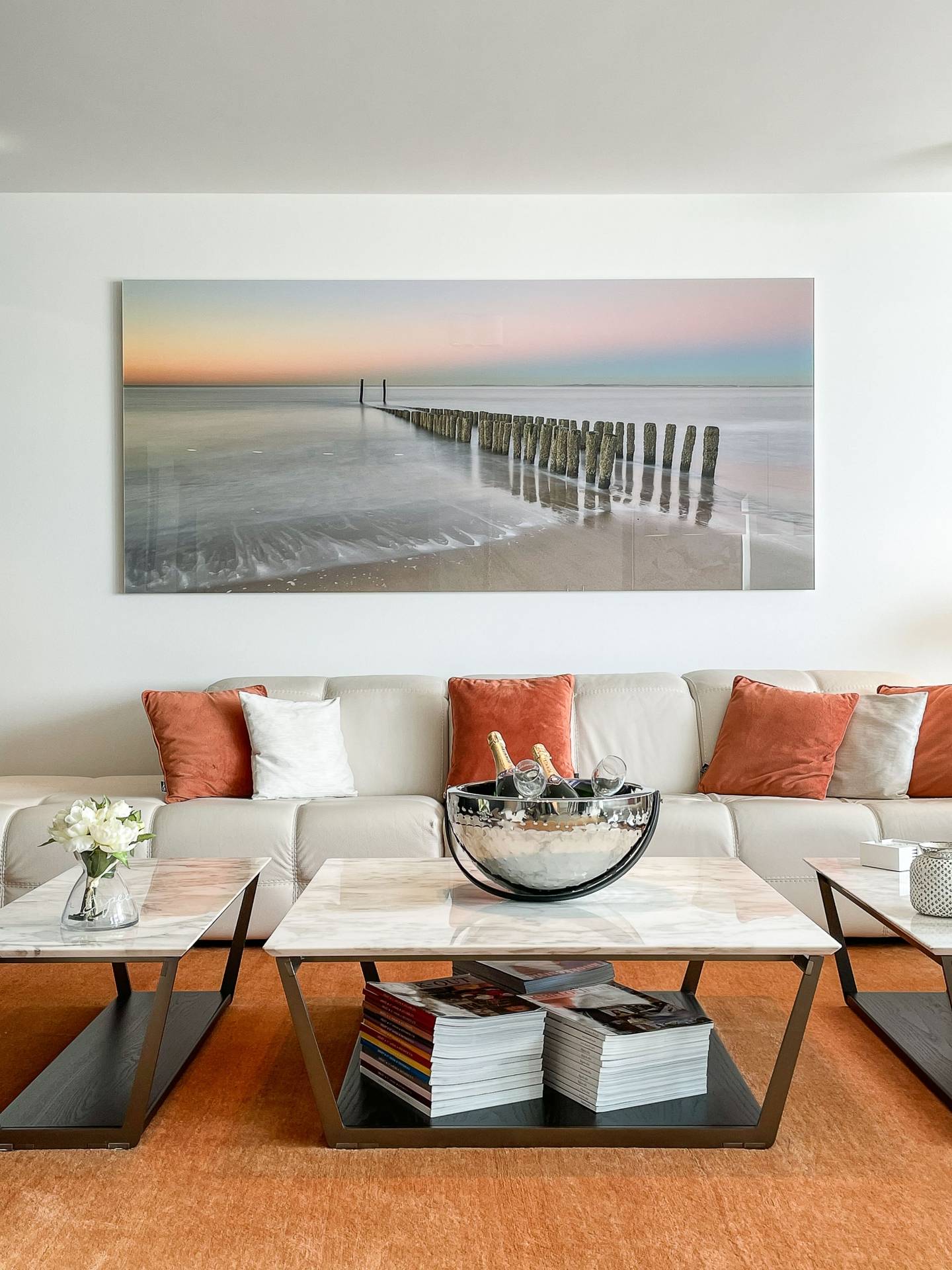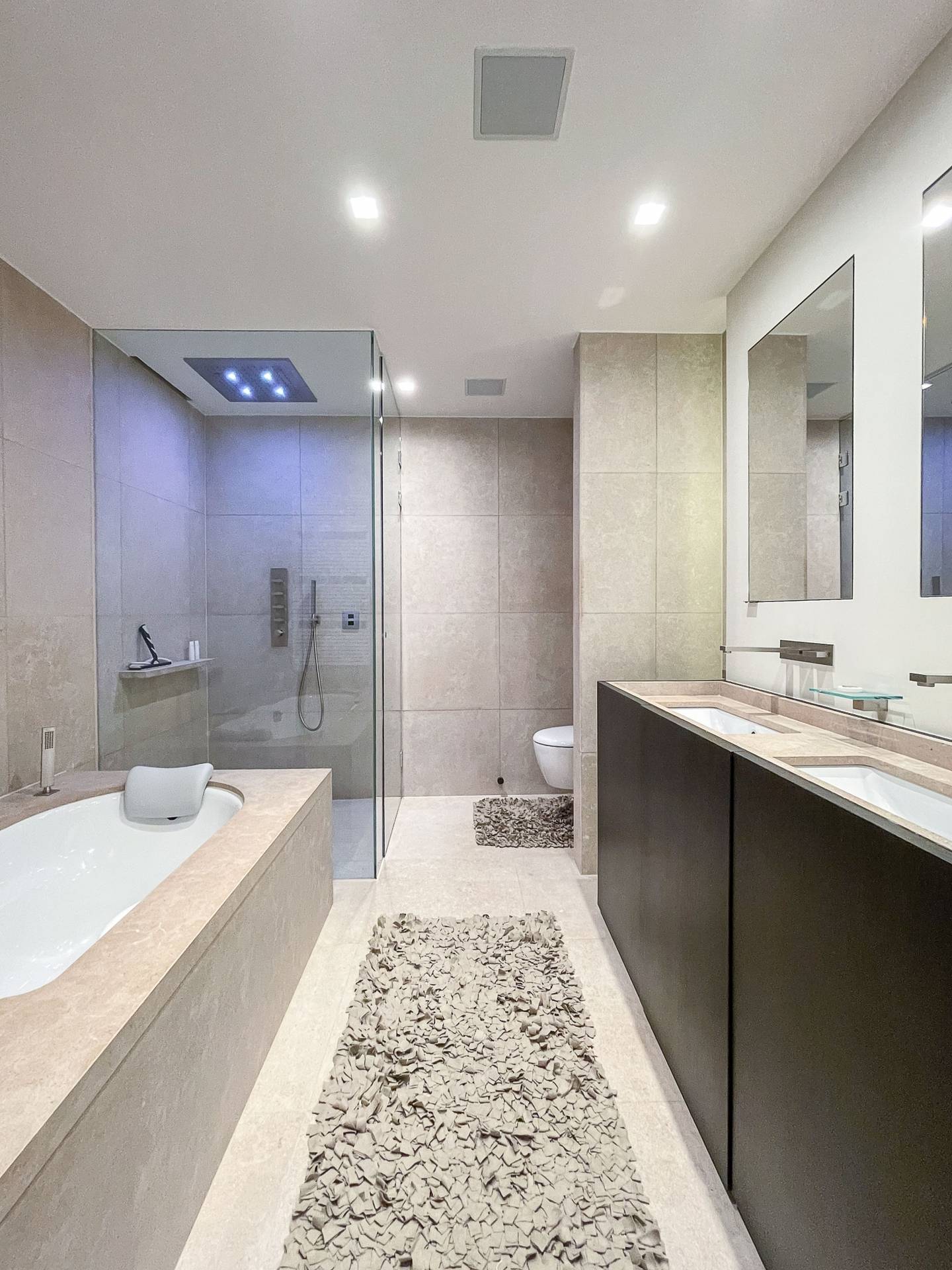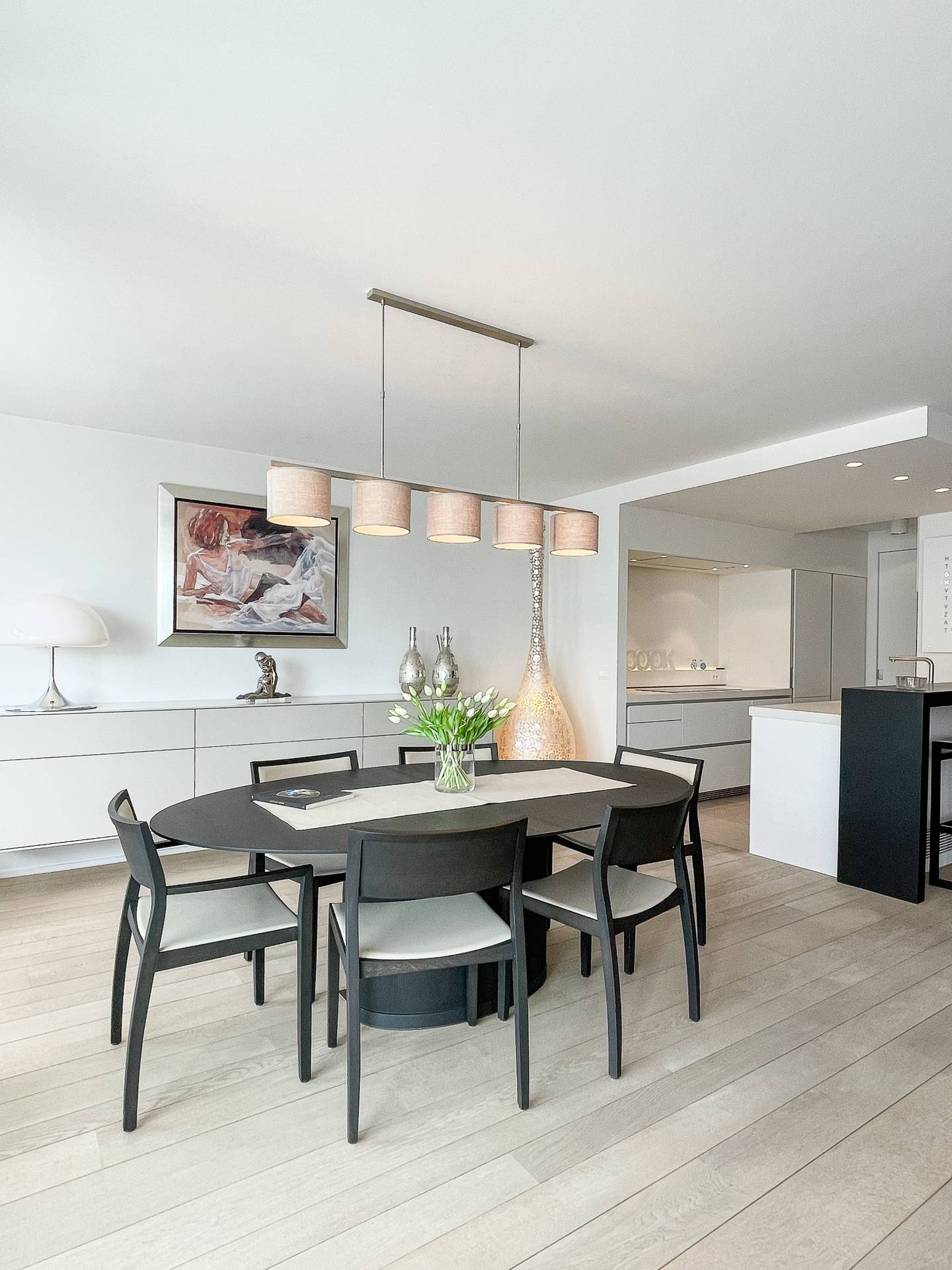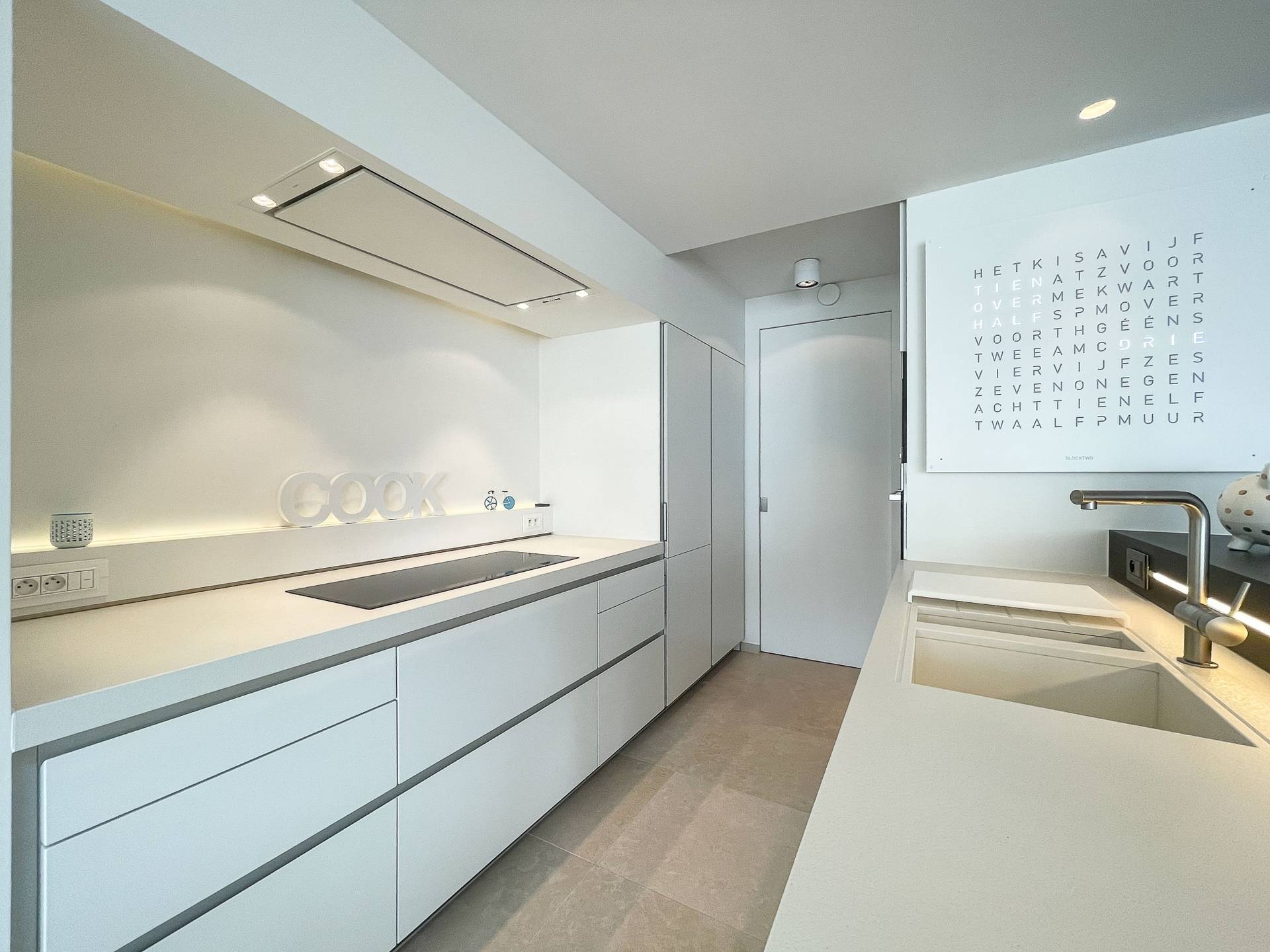 Composition: Hall d'entrée avec toilettes séparées. Séjour et salle à manger lumineux grâce à la belle largeur de la façade de 8m60, bénéficiant d'une terrasse couverte au milieu, avec une magnifique vue sur la mer. La cuisine ouverte avec coin petit-déjeuner est équipée d'appareils Miele et dispose d'un débarras pour la machine à laver et le sèche-linge. La chambre principale est équipée de placards et d'une salle de bains avec double lavabo, baignoire, douche et toilettes. La deuxième chambre à coucher est également assez spacieuse pour un lit double et la troisième chambre est légèrement plus petite, mais peut aussi accueillir un lit double. Deuxième salle de bains avec baignoire et double lavabo.