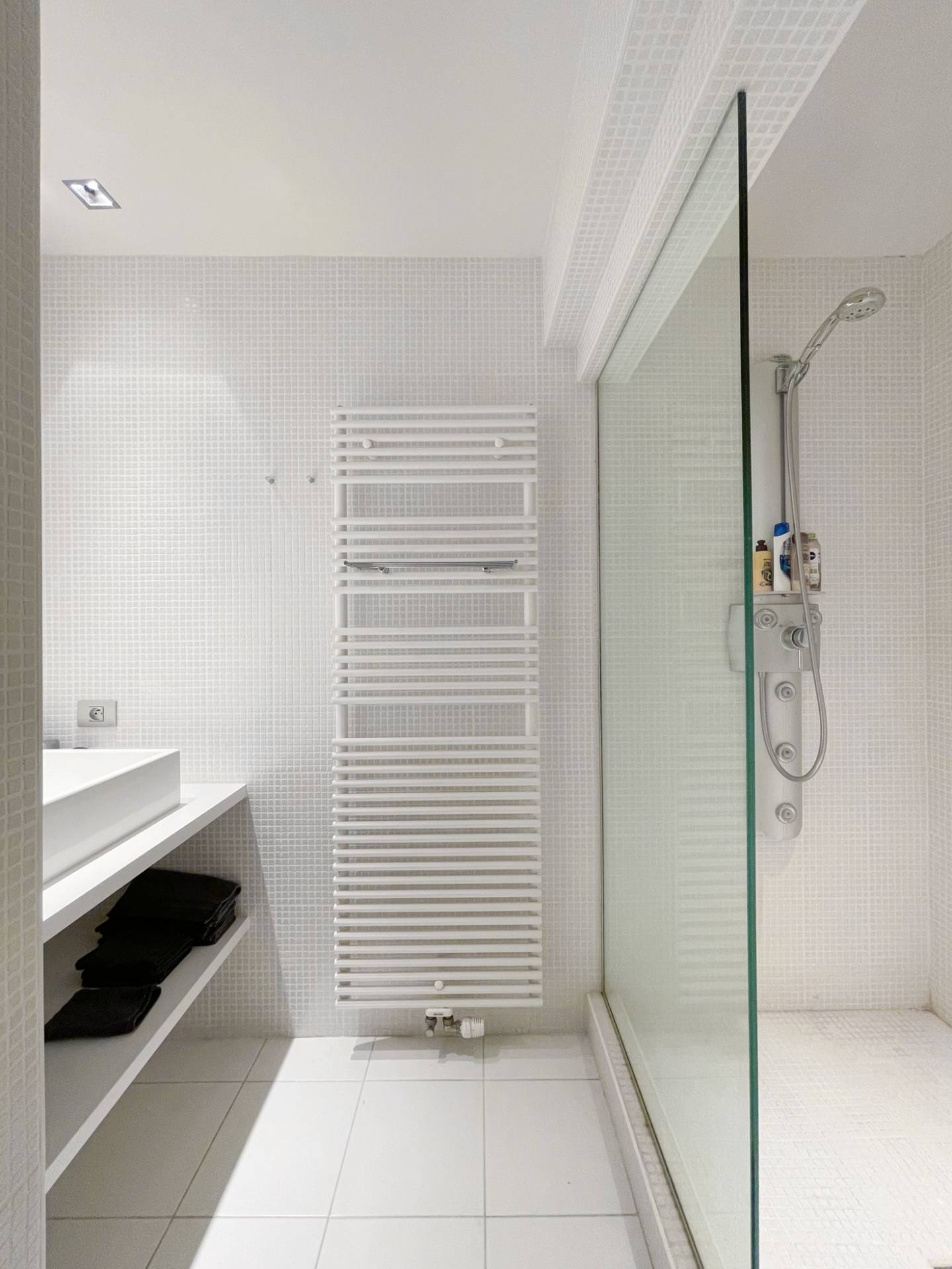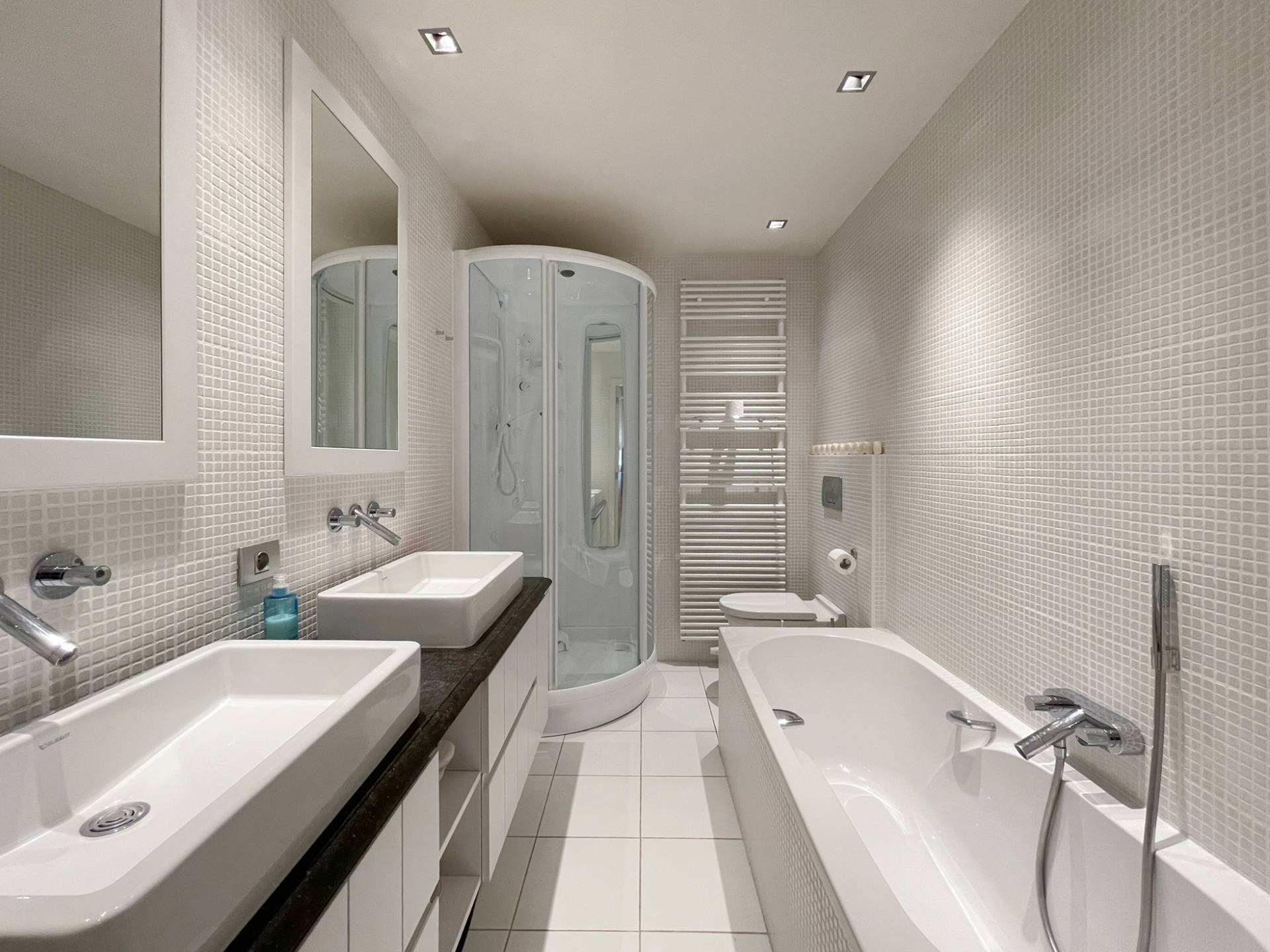 A l'arrière se trouvent 3 grandes chambres à coucher. Toutes équipées de placards intégrés dont une avec un dressing communicant et une salle de bains avec baignoire, douche et WC. Salle de douche avec grande douche à l'italienne. Débarras avec raccordement pour machine à laver.
