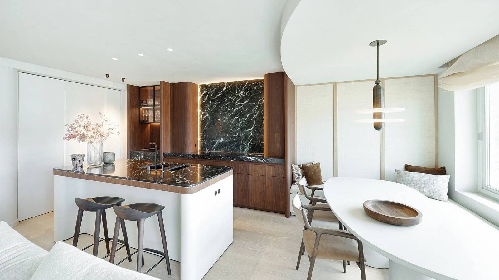 La cuisine ouverte, équipée d’appareils haut de gamme Miele et agrémentée de finitions en marbre, dégage un raffinement intemporel et s’accompagne d’un espace repas convivial, parfait pour recevoir dans un cadre élégant.