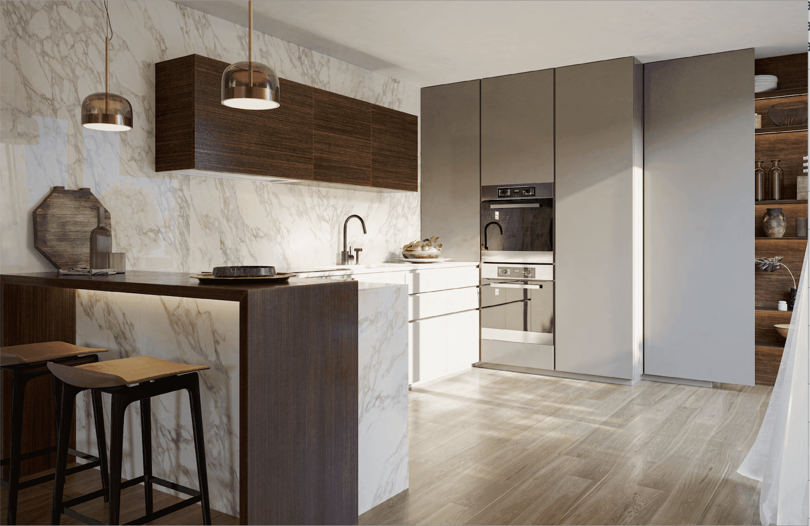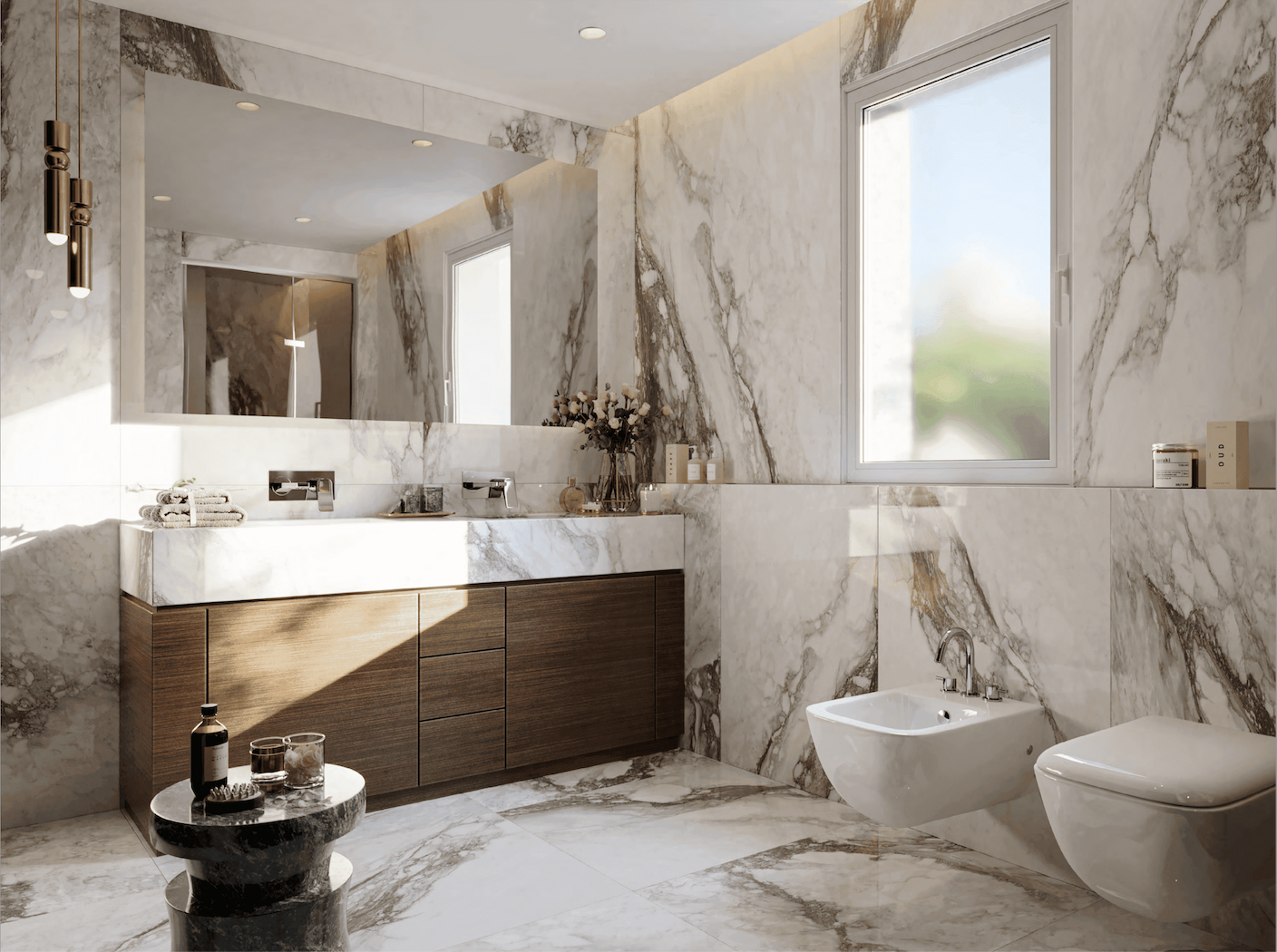 9ème étage : Un hall d’entrée somptueux avec escalier architectural et toilettes invités, qui mène au lumineux salon et salle à manger décloisonné, avec cuisine américaine. Deux chambres avec salle de bains.
