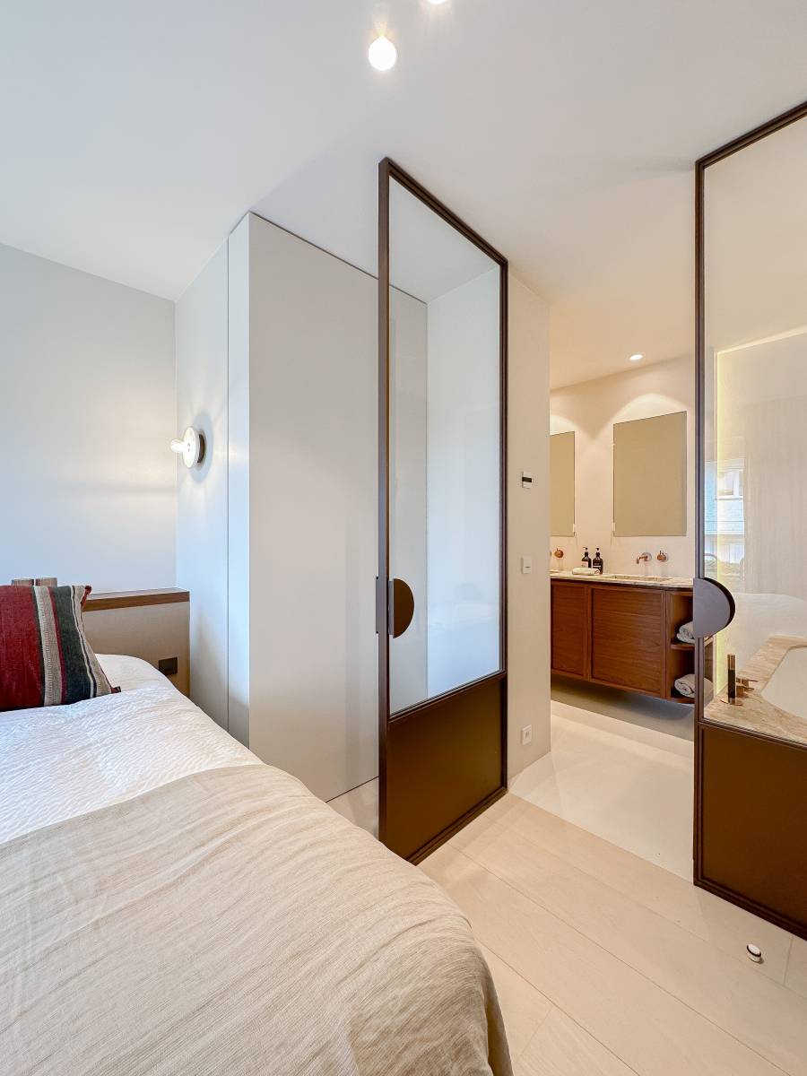 Il y a 4 chambres à coucher. La chambre principale dispose d'une salle de bains complète et luxueuse (baignoire, douche à l'italienne, double lavabo et toilettes). Les 2 autres chambres ont une salle de douche commune. La quatrième chambre est une chambre plus petite pour les lits superposés et dispose d'un coin bureau.