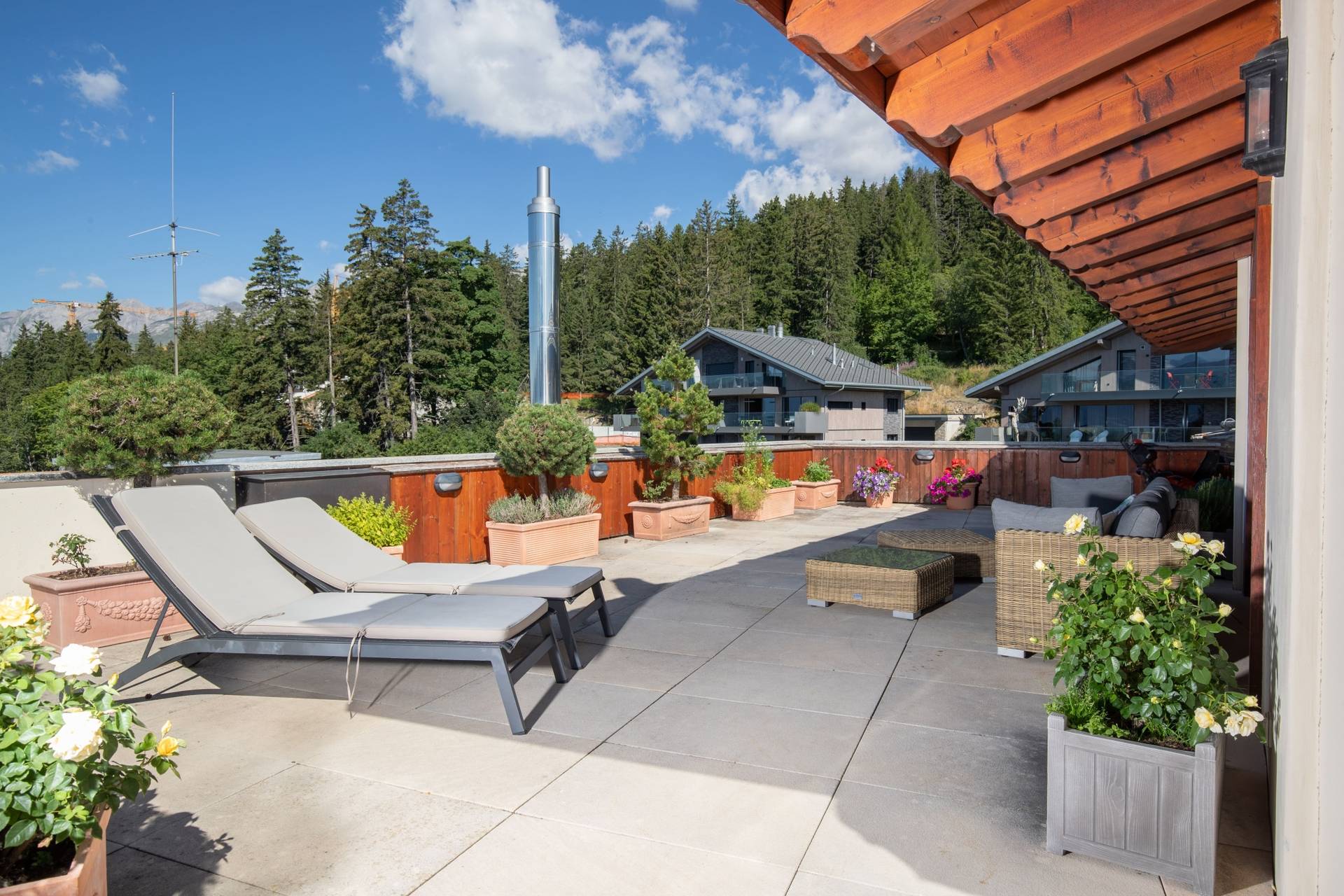 Composition : Salon chaleureux et spacieux avec salle à manger attenante, tous deux donnant sur une magnifique terrasse privée de plus de 120m2. Cette terrasse bénéficie d'une vue panoramique époustouflante sur les montagnes et les différents lacs de Crans Montana. Cuisine spacieuse équipée d'appareils modernes et d'un îlot central.