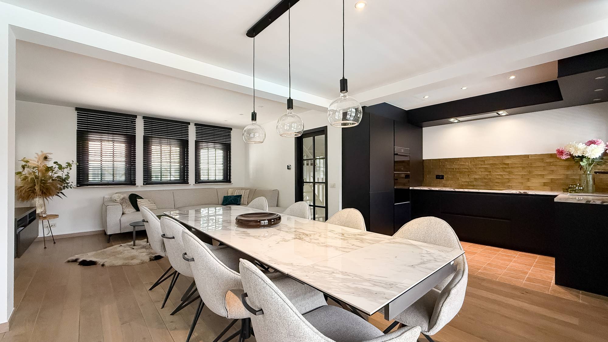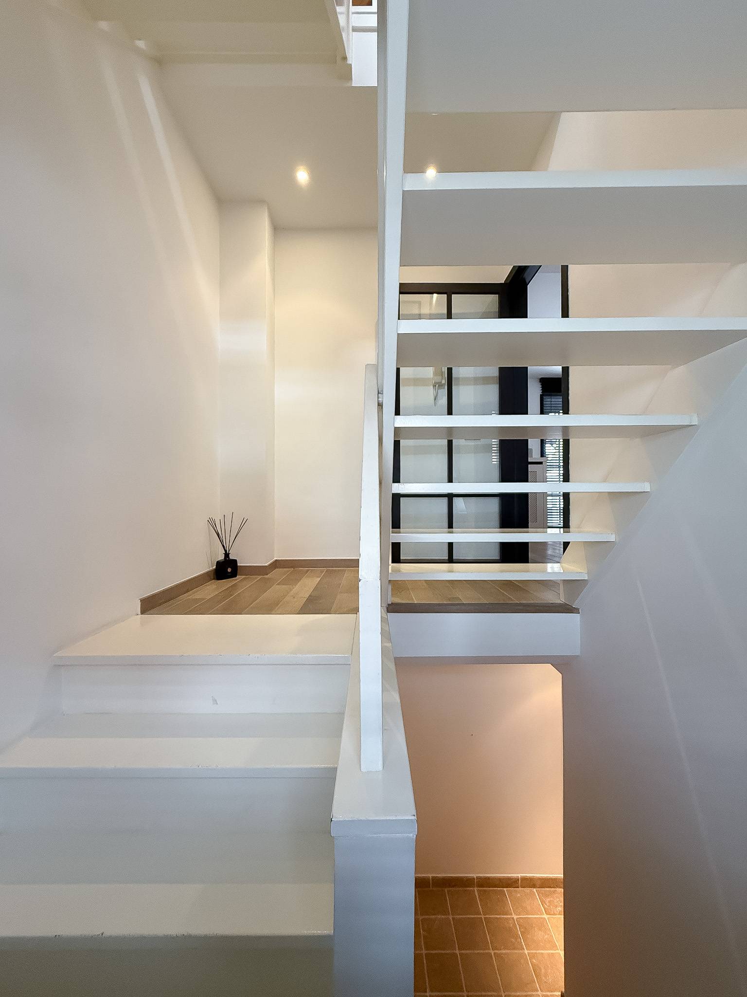 Au rez-de-chaussée: entrée accueillante. Quelques marches plus haut, vous accédez au séjour convivial et à la cuisine ouverte avec accès direct à la terrasse.