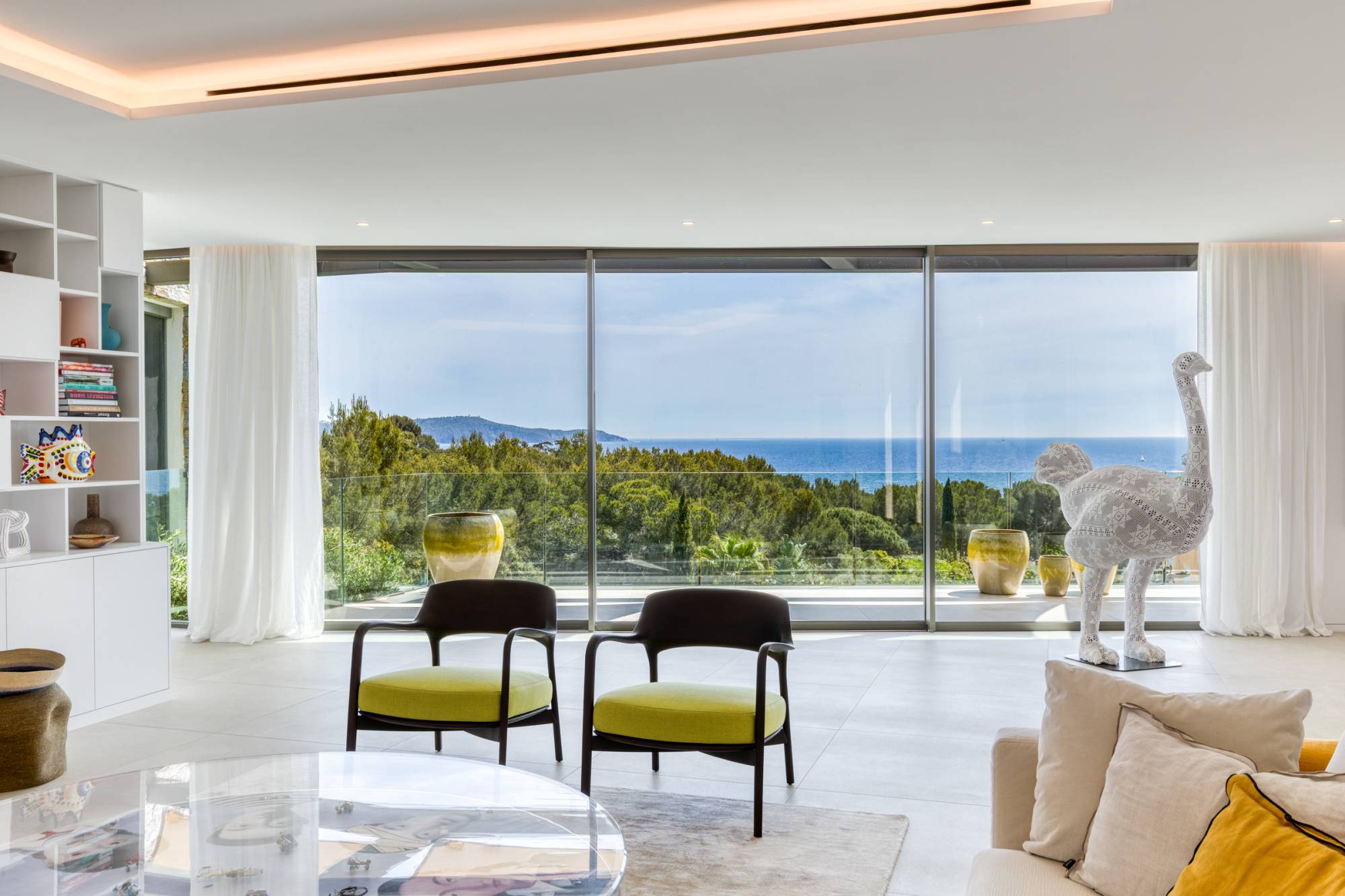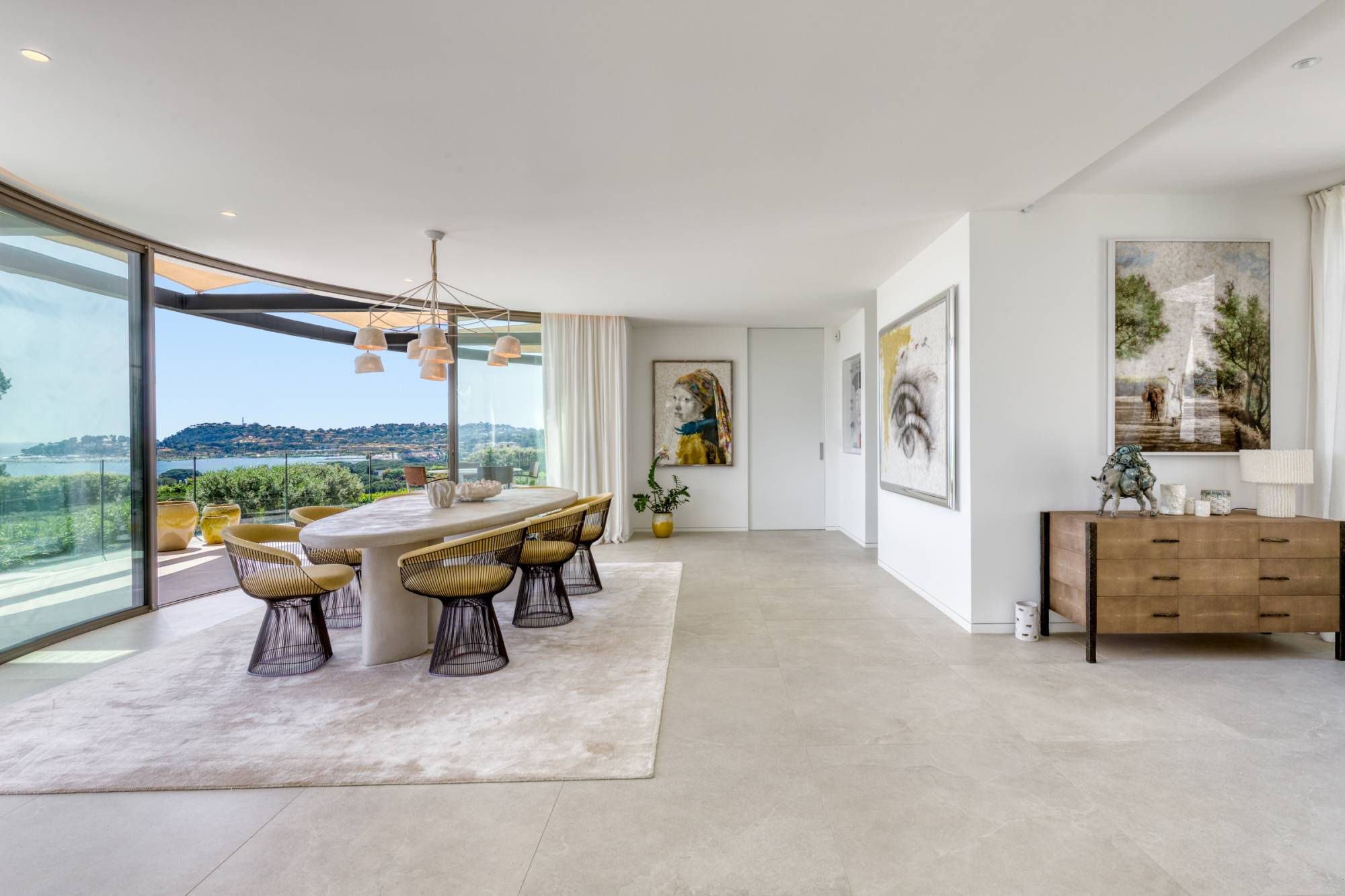 L’intérieur, baigné de lumière grâce à de grandes ouvertures, s’étend sur trois niveaux et propose des prestations haut de gamme. L’espace de vie principal, entièrement tourné vers la mer, dévoile une vue panoramique exceptionnelle à 180 degrés. Il comprend un vaste séjour avec cheminée, une cuisine hautement équipée, une salle à manger conviviale, une arrière-cuisine et une suite parentale avec dressing et salle de bain luxueuse. Chaque espace bénéficie d’un accès direct à une grande terrasse où le bleu de la mer s’étend à l’infini.