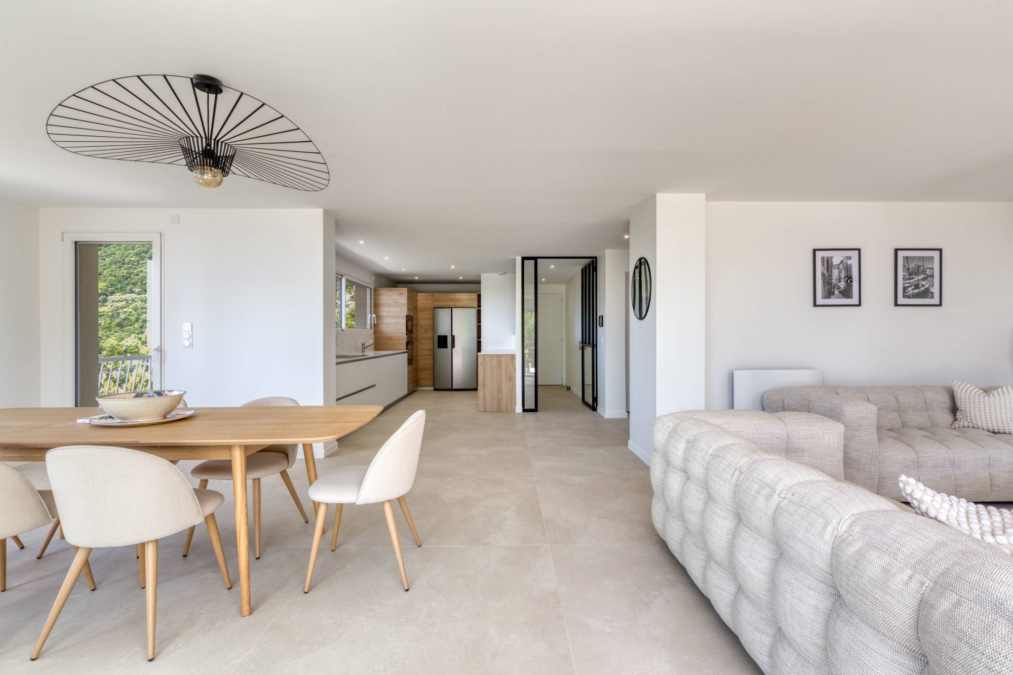 Dès l’entrée, la villa séduit par ses volumes et sa luminosité. Le rez-de-chaussée se compose d’un hall d’accueil avec toilettes invités, d’un vaste séjour baigné de lumière naturelle agrémenté d’une cheminée, et d’une grande cuisine ouverte entièrement équipée. Cette pièce de vie s’ouvre directement sur une spacieuse terrasse, idéale pour profiter des repas en plein air face à la mer.