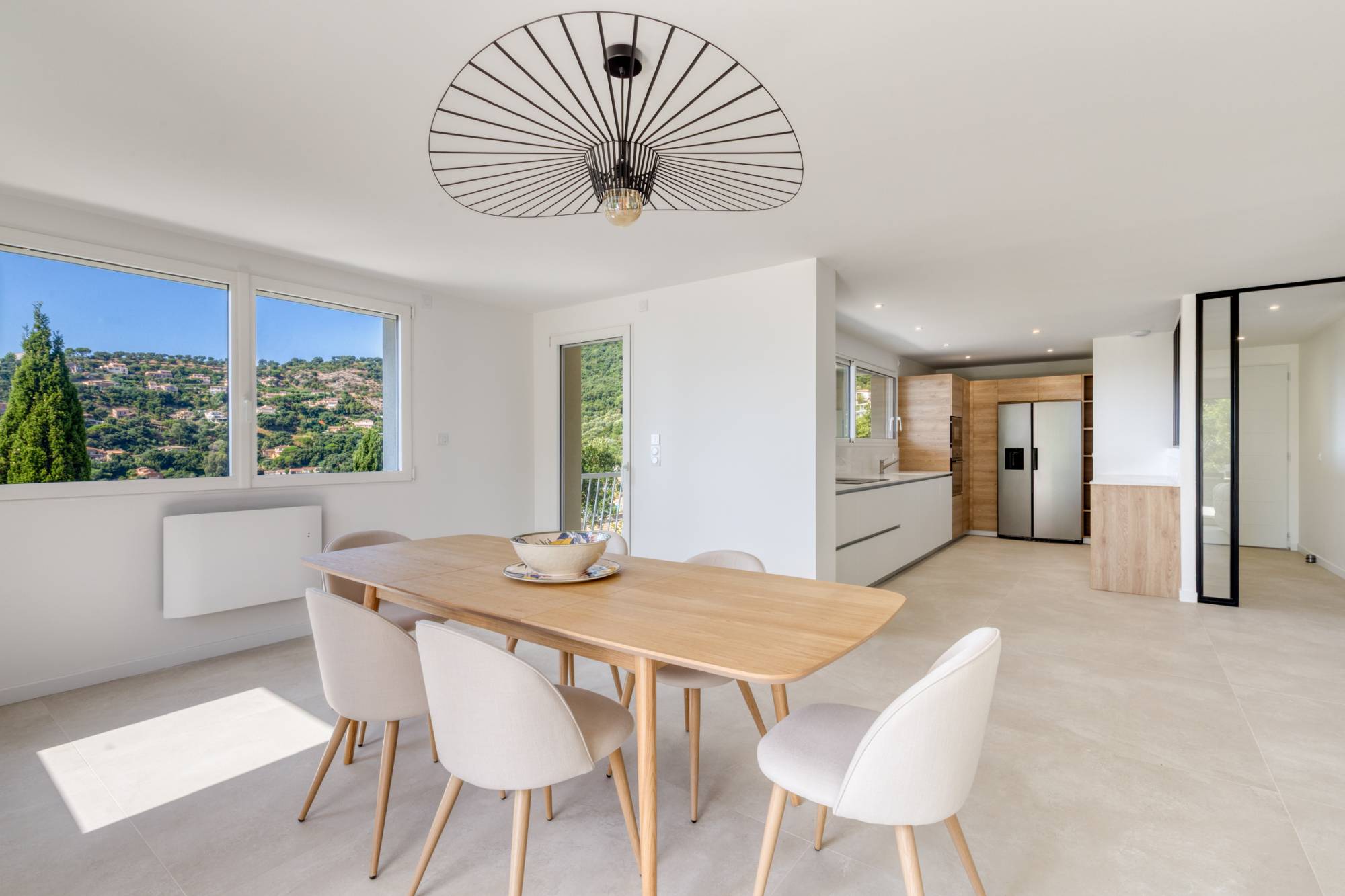 Dans un quartier résidentiel paisible de Cavalaire-sur-Mer, cette élégante villa d’environ 150 m², entièrement rénovée avec soin, allie charme, confort et prestations de qualité. Nichée dans un environnement calme et verdoyant, elle bénéficie d’un ensoleillement optimal tout au long de la journée ainsi que d’une très belle vue sur la mer Méditerranée.