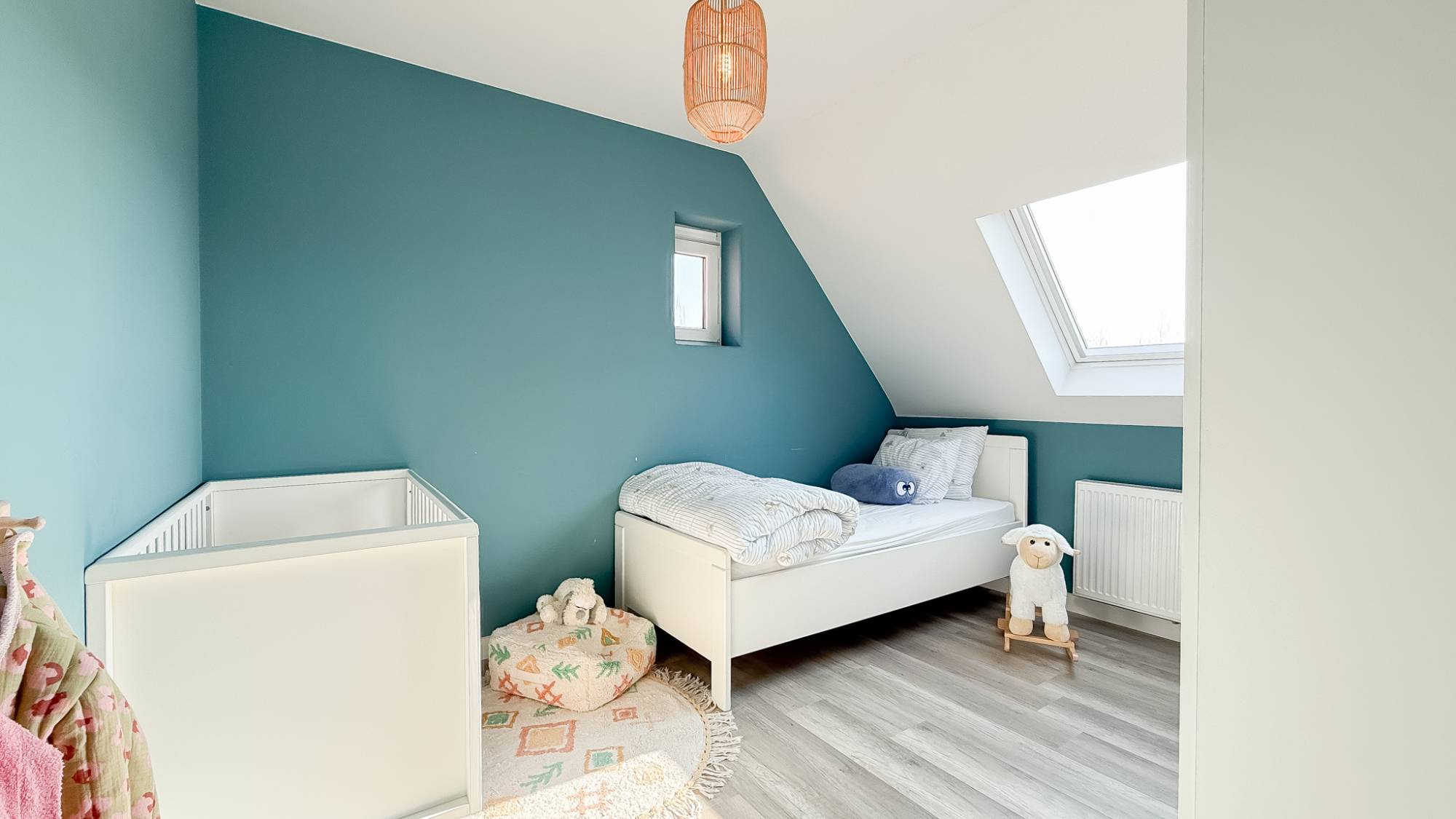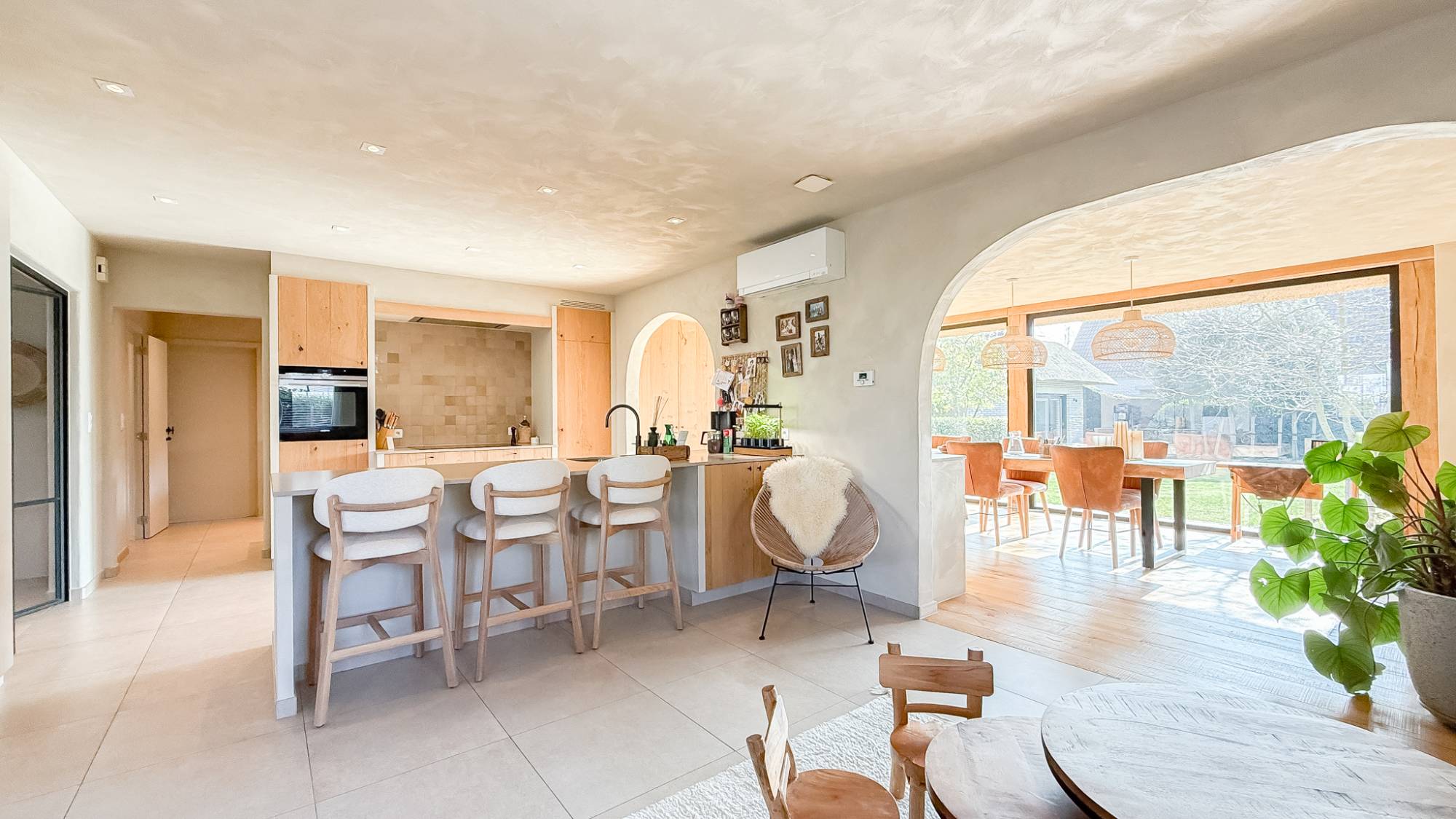 Le séjour a été aménagé avec beaucoup de soin et s’ouvre harmonieusement sur la cuisine ouverte, véritable cœur de la maison. Cette cuisine entièrement équipée, avec un coin petit-déjeuner convivial, invite à partager des moments en famille et constitue le centre de la vie quotidienne. L’aménagement ouvert et le choix de matériaux chaleureux confèrent une atmosphère moderne tout en restant accueillante.
