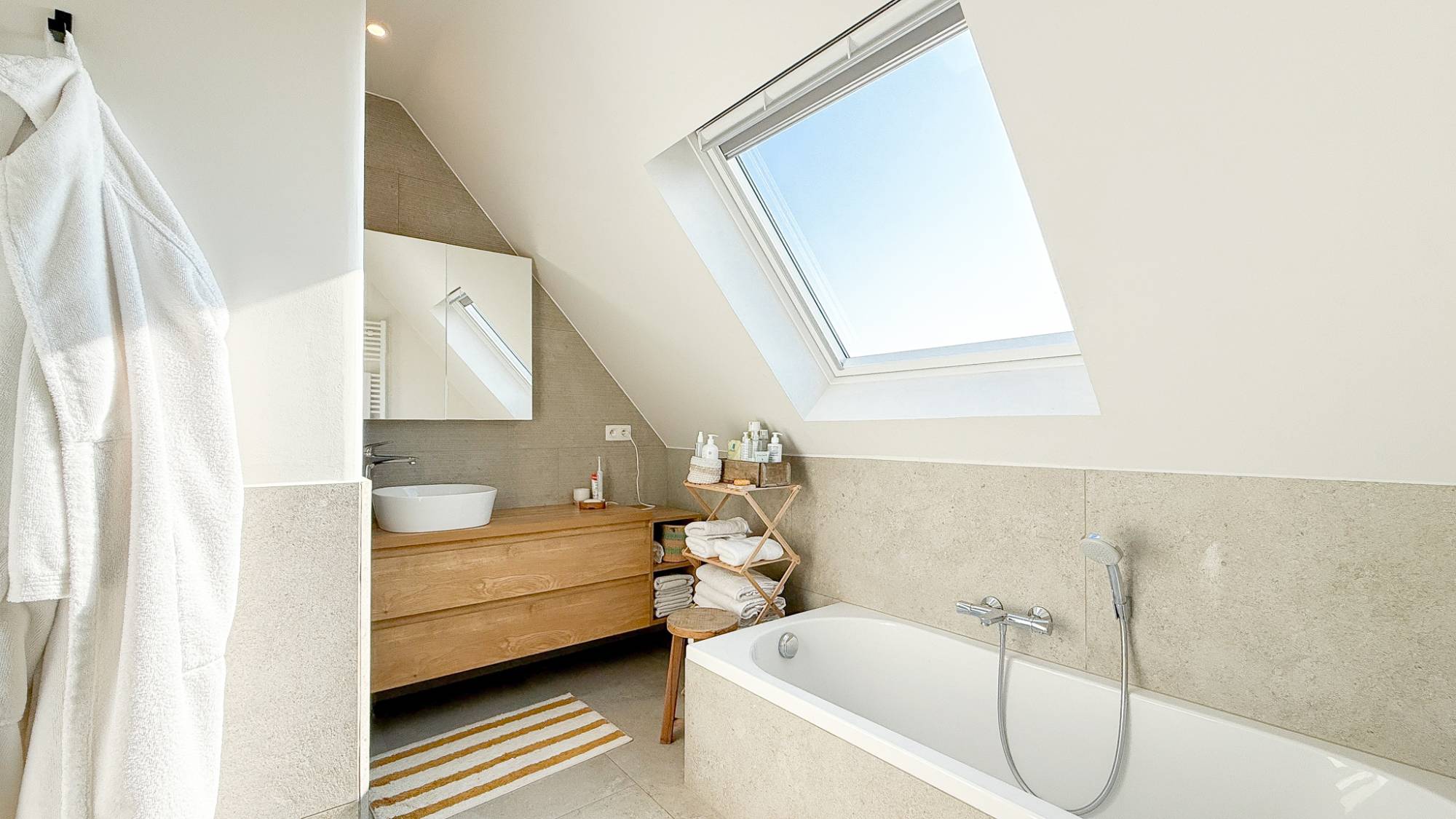 Premier étage: À l’étage se trouve la chambre principale avec dressing attenant. La salle de bains séparée est équipée d’une baignoire, d’une douche à l’italienne et d’un lavabo. Deux autres chambres complètent ce niveau.