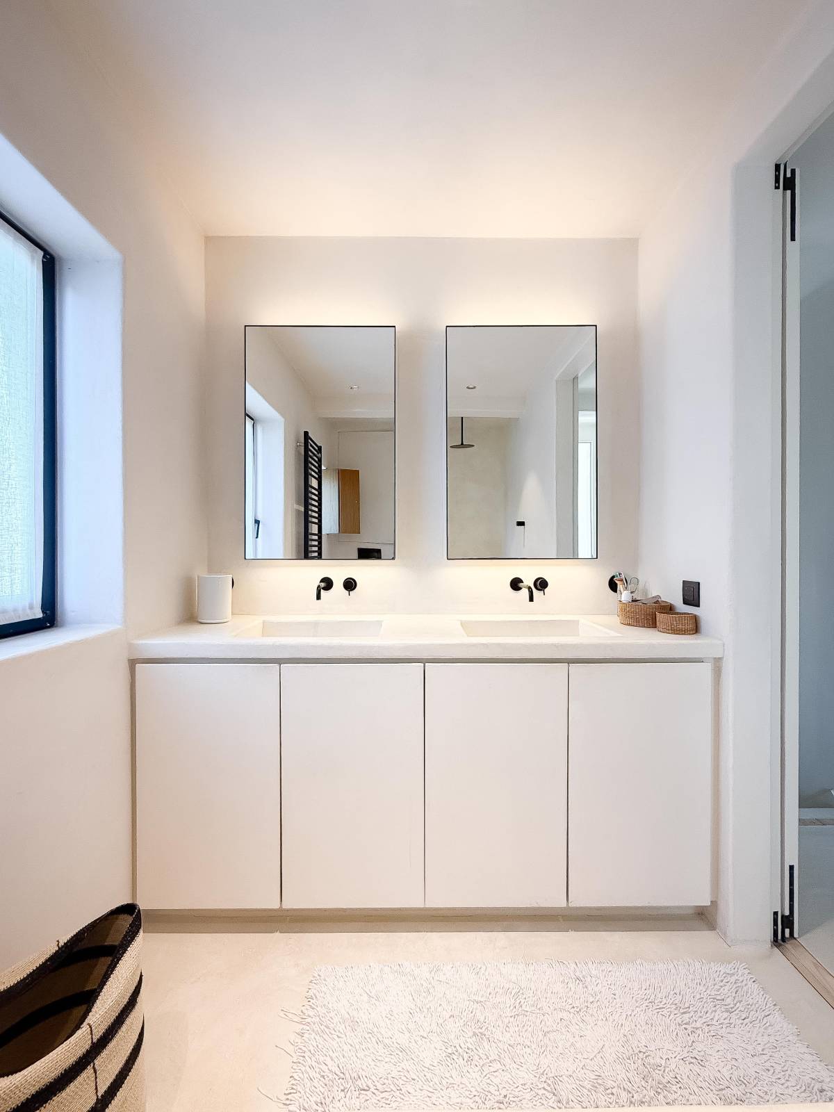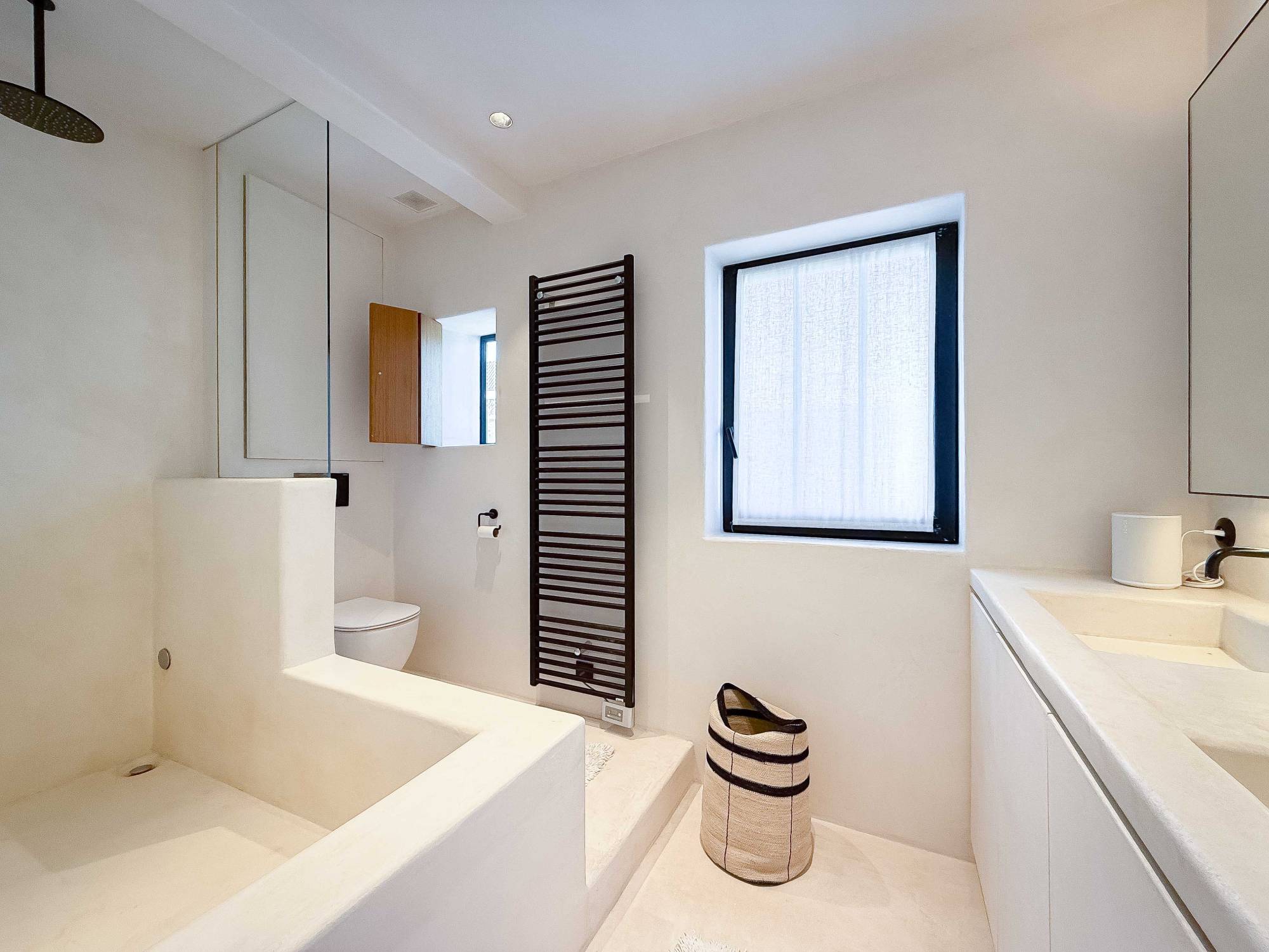 Au premier étage, vous trouverez trois chambres à coucher de taille confortable. La salle de bains principale comprend une double vasque, une baignoire/douche et des toilettes, avec une finition élégante en béton ciré. L’une des chambres dispose également de sa propre salle de douche attenante, idéale pour accueillir vos invités ou pour un adolescent. Le deuxième étage abrite une quatrième chambre, dotée de nombreux placards intégrés.