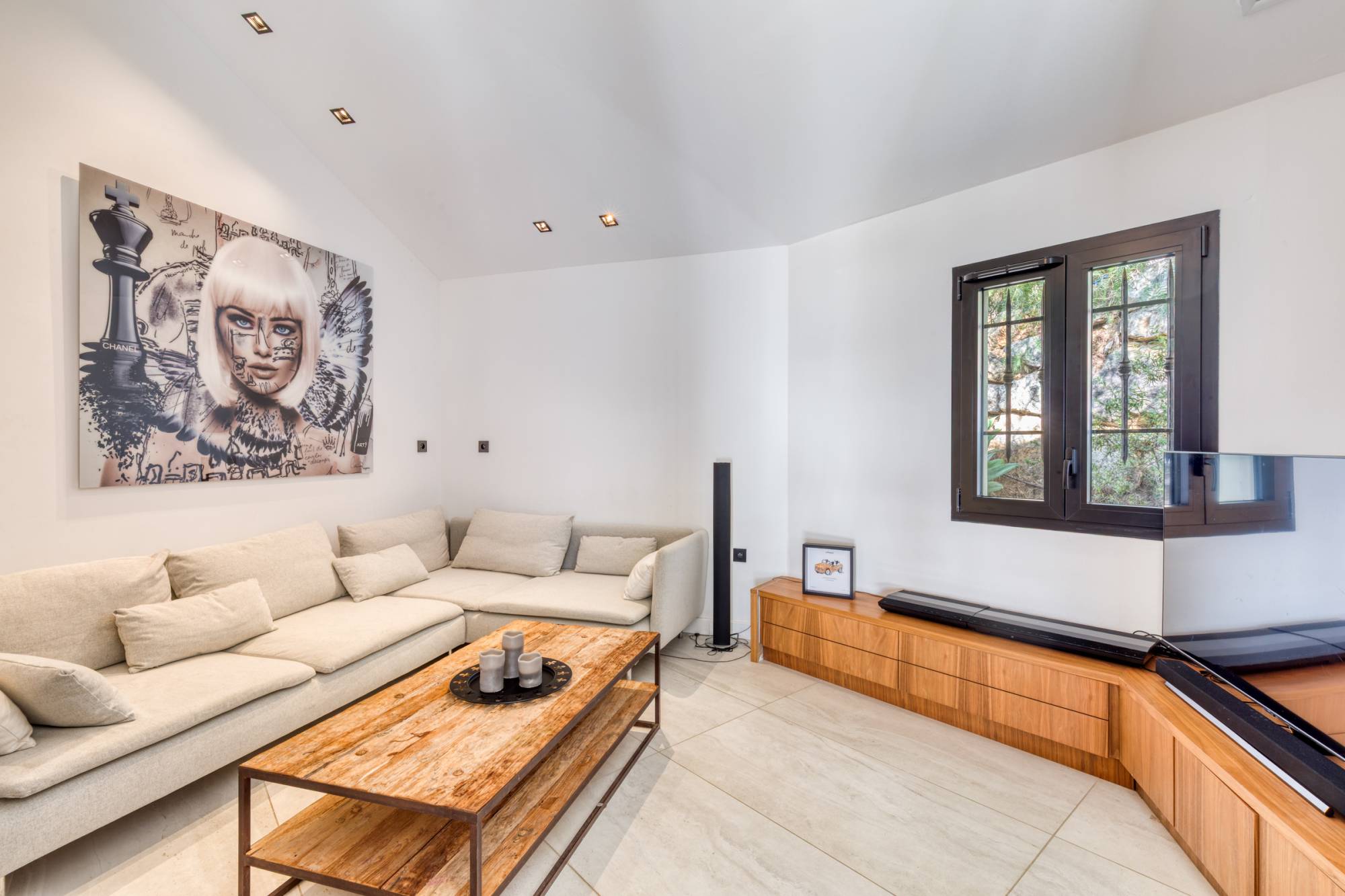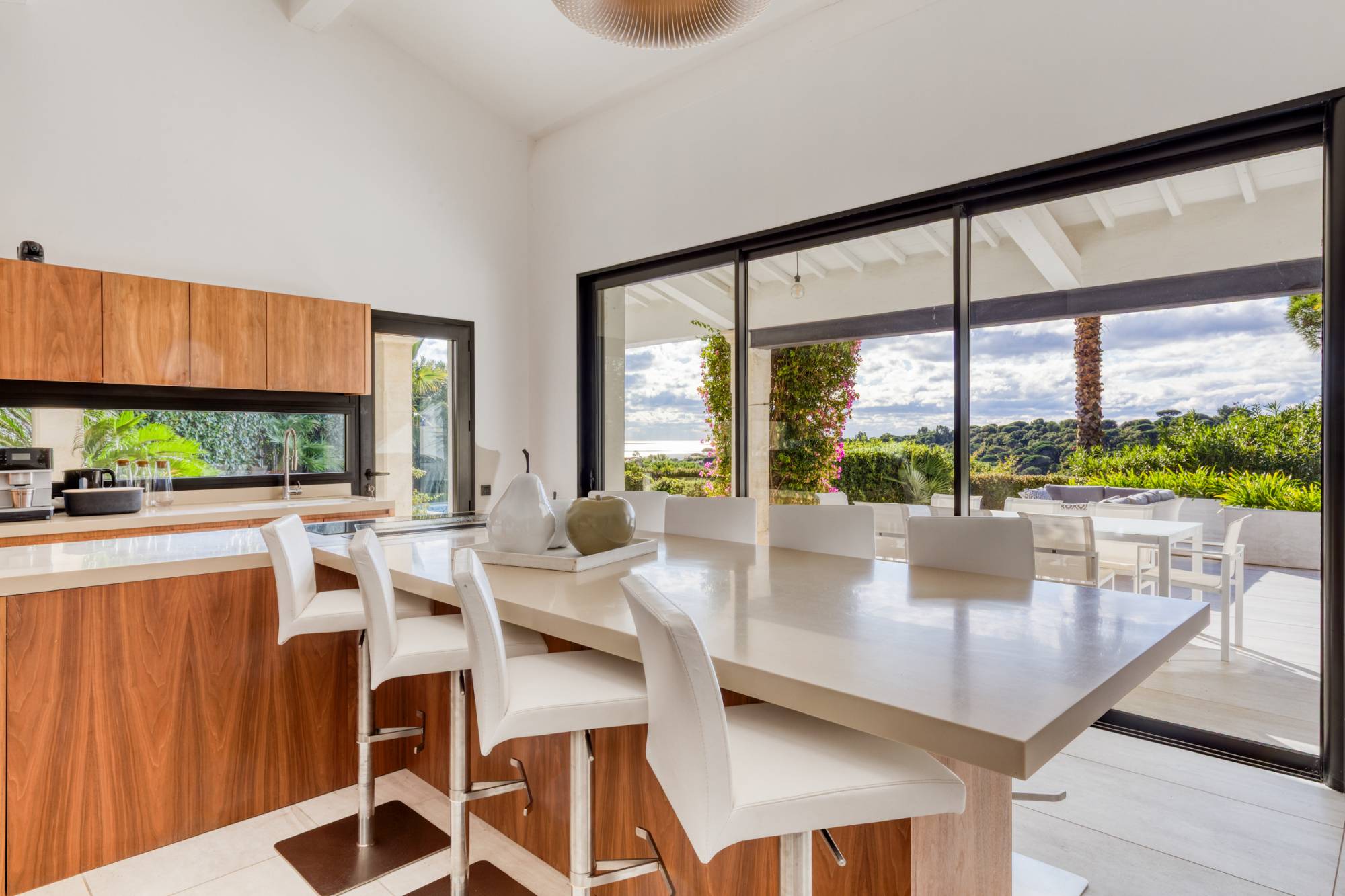 D’une surface de 195 m², la villa propose quatre chambres en suite et un grand espace de vie lumineux, ouvert sur de belles terrasses grâce à une vaste baie vitrée à galandage. L’intérieur se prolonge harmonieusement vers le jardin paysager, comprenant une piscine à débordement chauffée offrant un panorama unique sur la mer et les pins parasols.