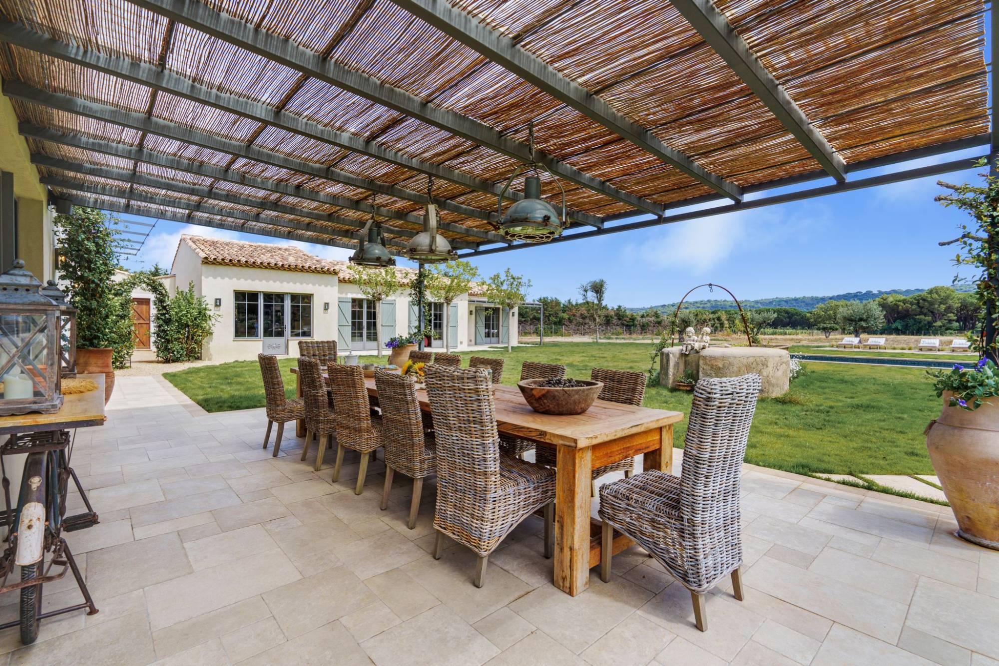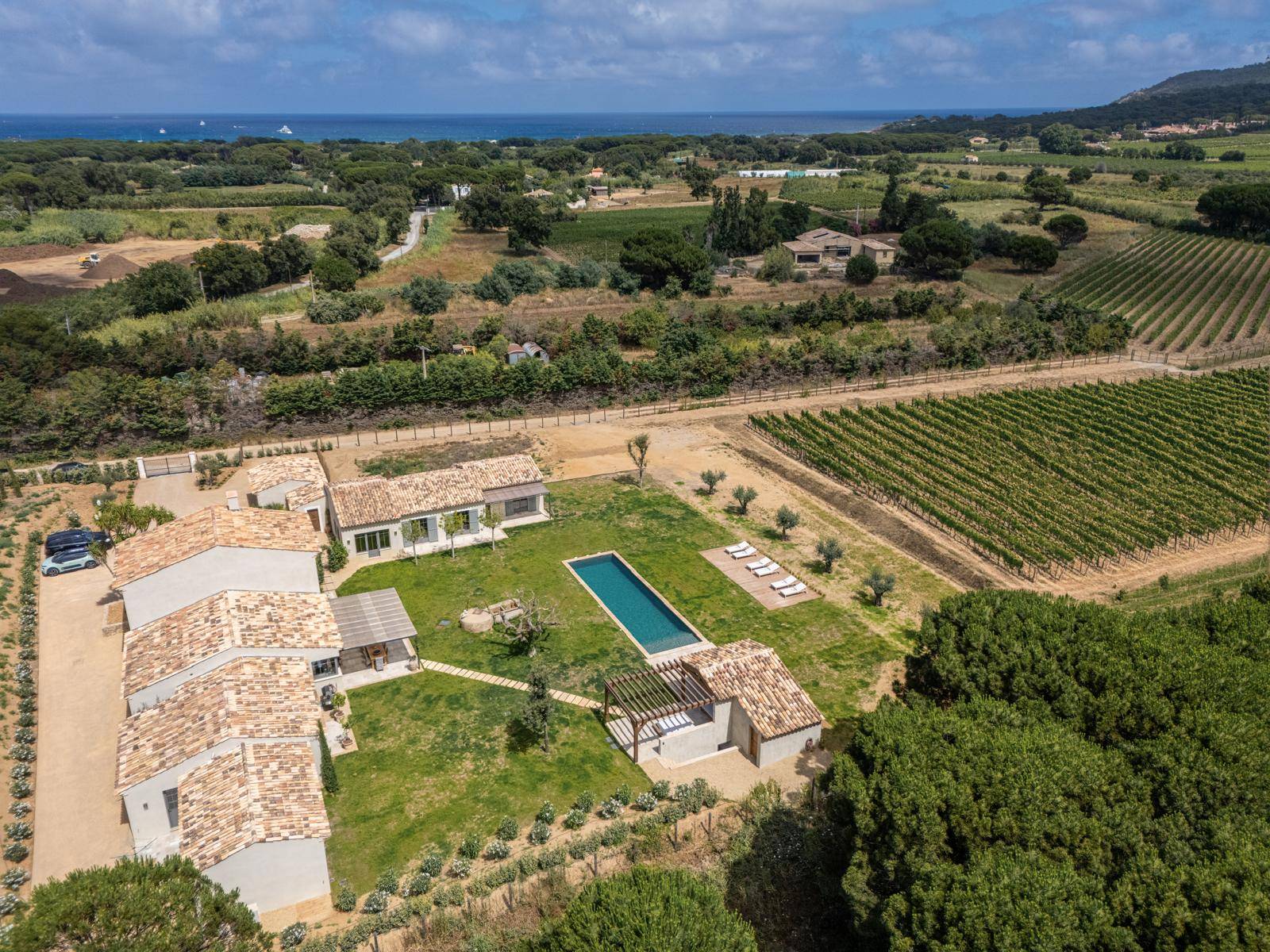 Idéalement située à mi-chemin entre Saint-Tropez et Ramatuelle, avec un accès rapide à la plage de Pampelonne, le bâtiment principal comprend une superbe cuisine ouverte, entièrement équipée et donnant sur un vaste salon avec une grande cheminée. Au rez-de-chaussée, vous trouverez deux chambres, chacune avec sa salle de bain privée et son dressing. À l’étage, une suite parentale de 45 m² offre une vue imprenable sur la nature.