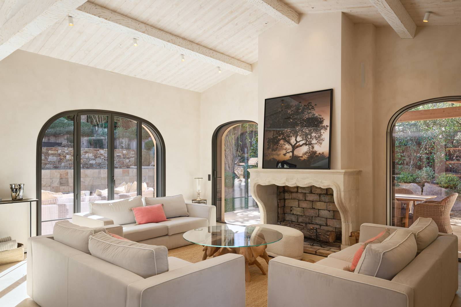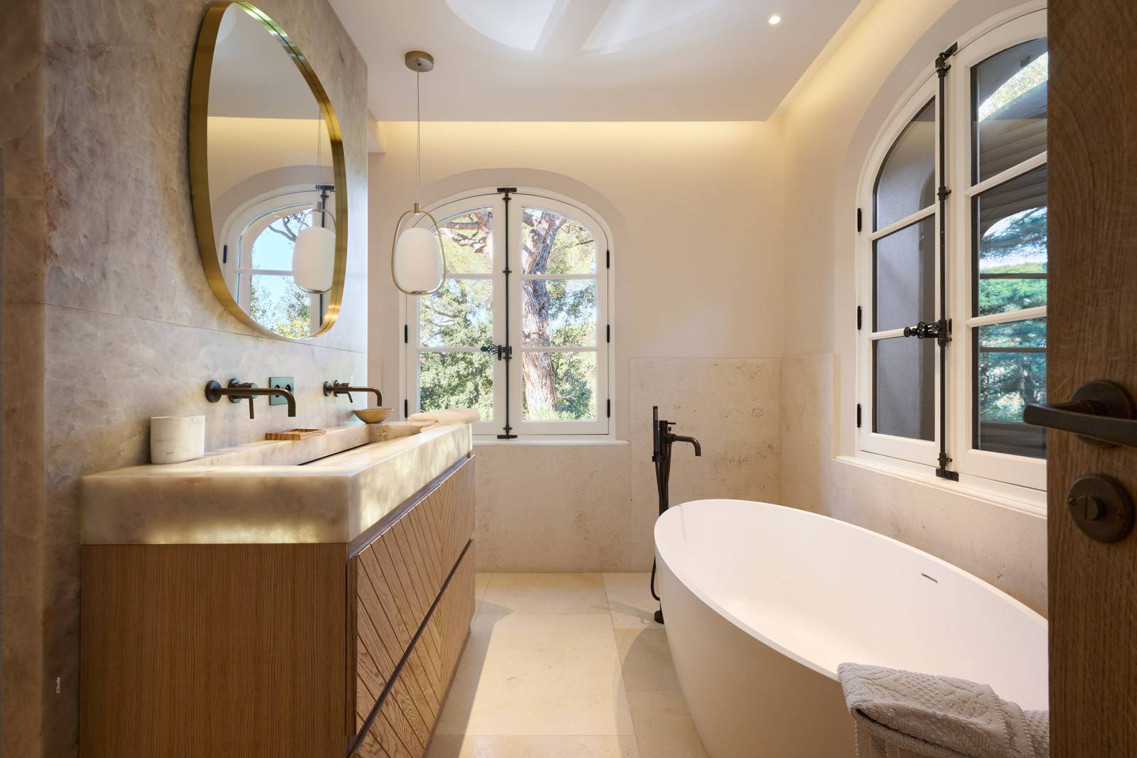 À l’étage, trois chambres en suite prolongées par des terrasses offrent une vue dégagée sur le parc paysager et la piscine à débordement, créant une atmosphère de sérénité et de détente.