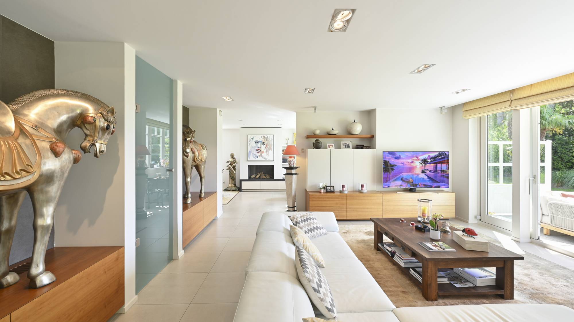 Disposition: Le vaste hall d’entrée avec vestiaire et toilettes invités mène à un séjour raffiné avec vue dégagée sur la verdure. À côté, un bureau chaleureux avec cheminée offre un cadre idéal pour le travail en toute sérénité. La salle à manger ainsi que la cuisine ouverte entièrement équipée s’ouvrent sur une terrasse ensoleillée et un jardin magnifiquement aménagé. Une grande buanderie avec espace de rangement complète ce niveau.