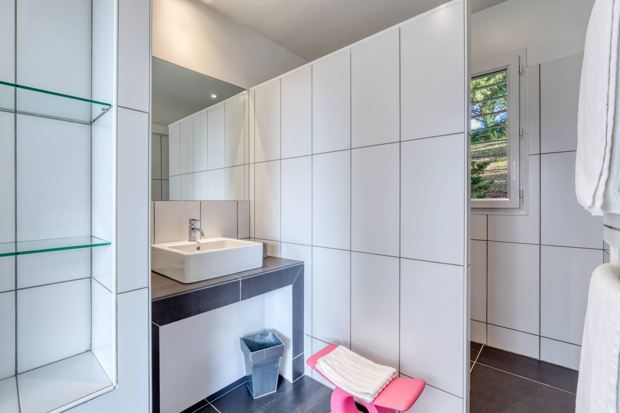 Le niveau principal accueille un vaste séjour épuré avec cheminée, largement ouvert sur une grande terrasse. Il comprend également une cuisine avec espace salle à manger, ainsi qu’un second salon pouvant être totalement indépendant, équipé d’une kitchenette, de trois chambres et d’une salle de bains — idéal pour recevoir famille ou invités en toute autonomie.