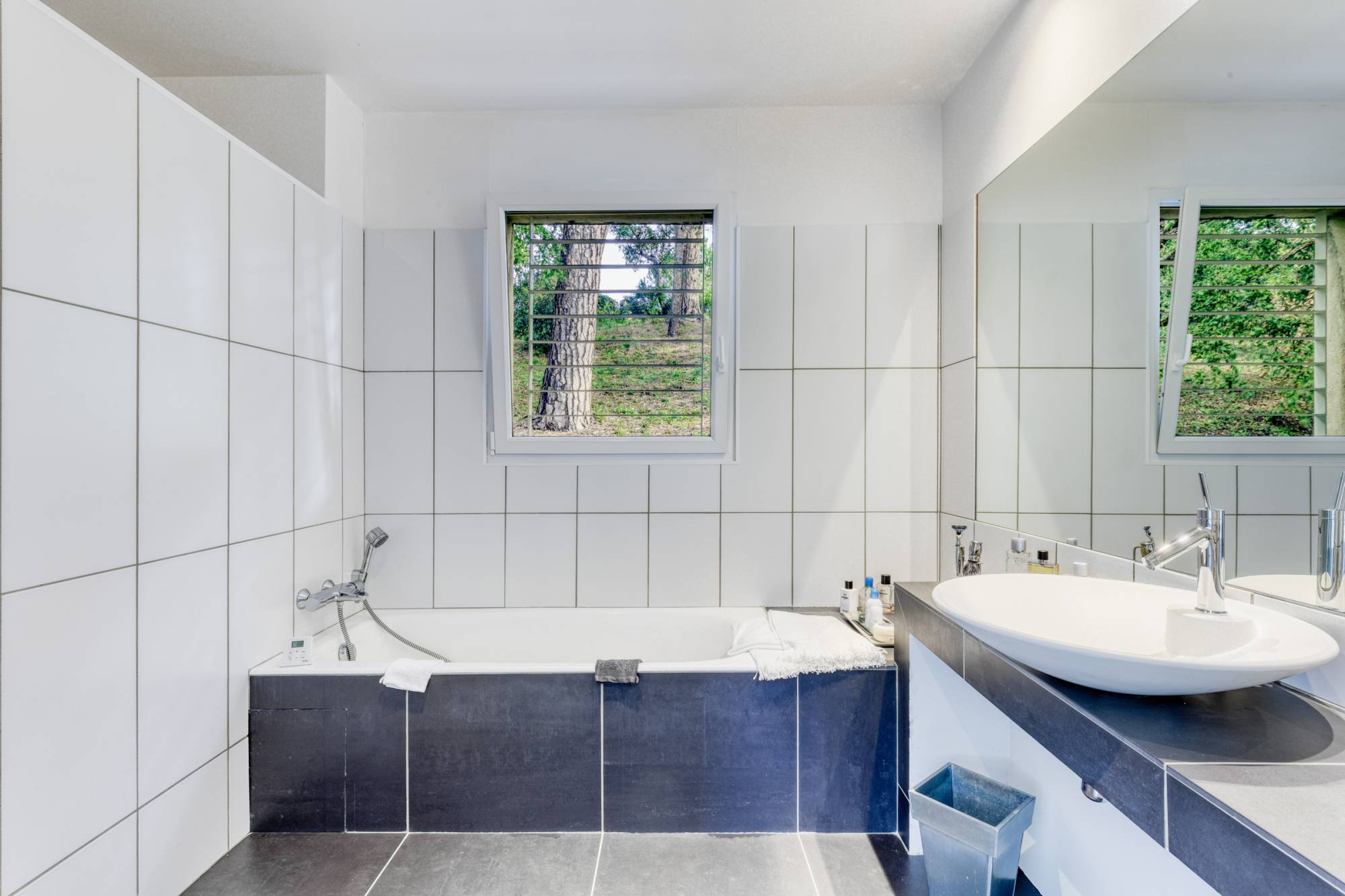 À l’étage, l’espace nuit propose trois chambres, dont une suite parentale avec salle de bains, dressing et terrasse privative, ainsi que deux chambres se partageant une salle de bains.