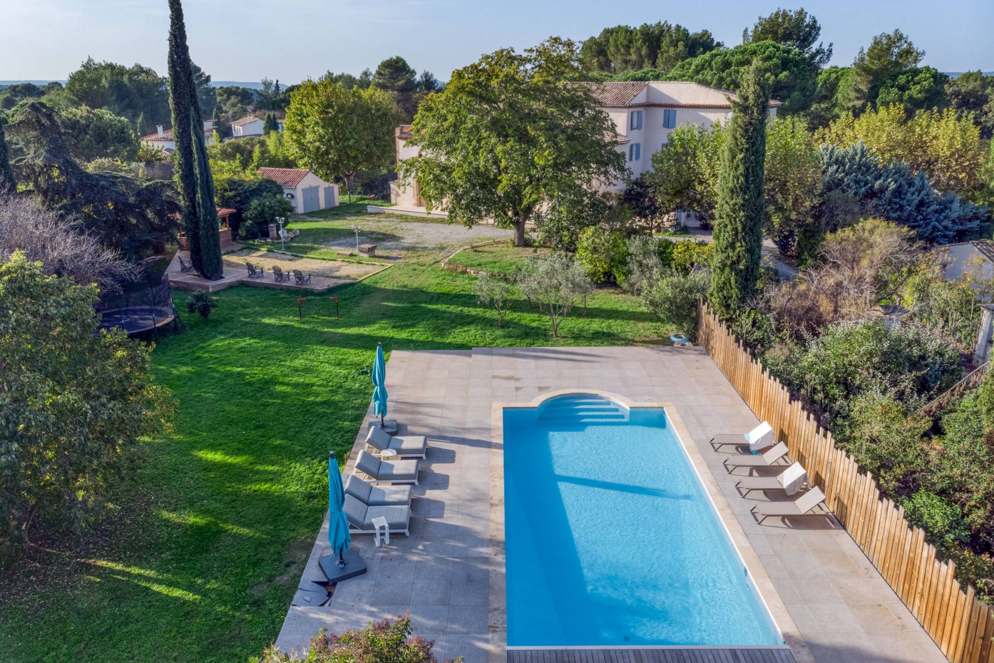 Établie sur un terrain paysagé et clôturé de 8 000 m², la propriété bénéficie d’une grande piscine, d’un terrain de pétanque et d’un puits, parfaits pour profiter de moments de détente en plein air.