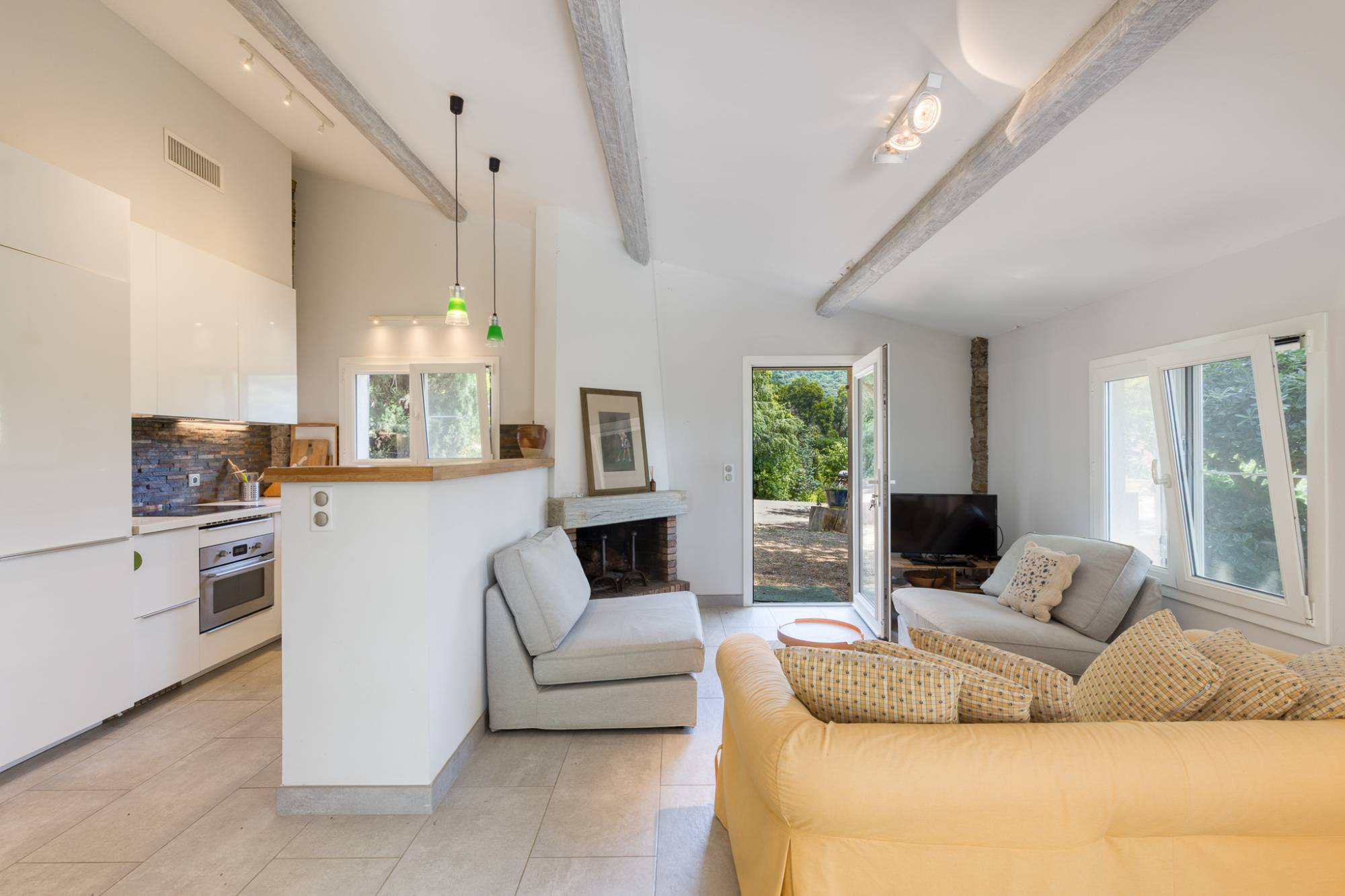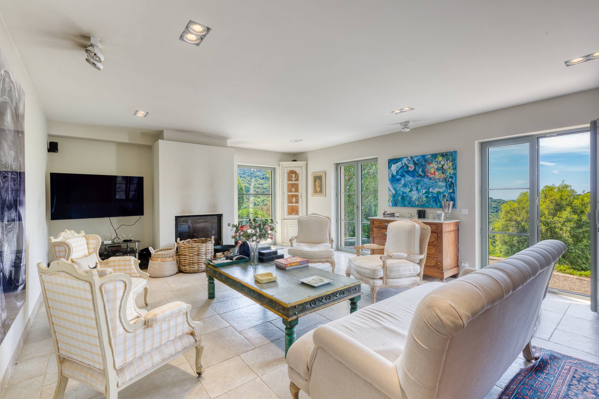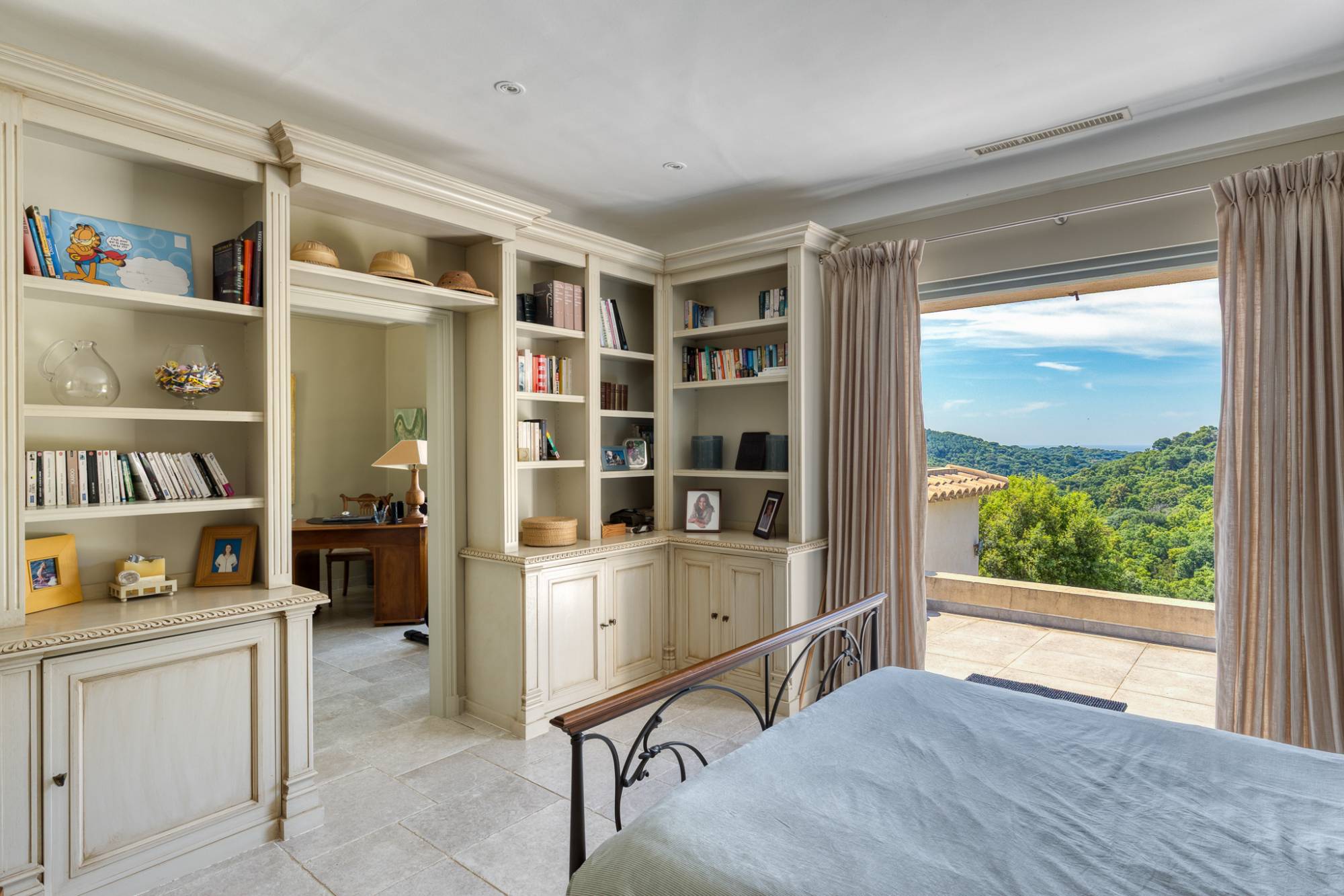 La villa principale offre un vaste salon avec cheminée, ouvert sur une salle à manger et une cuisine haut de gamme entièrement équipée. Une suite parentale exceptionnelle de 60 m² comprend deux bureaux, un dressing, une salle de bains et une chambre ouvrant sur une grande terrasse plein sud avec vue dégagée et aperçu mer. Une seconde aile de la maison propose quatre chambres en suite, chacune bénéficiant d’un accès indépendant.