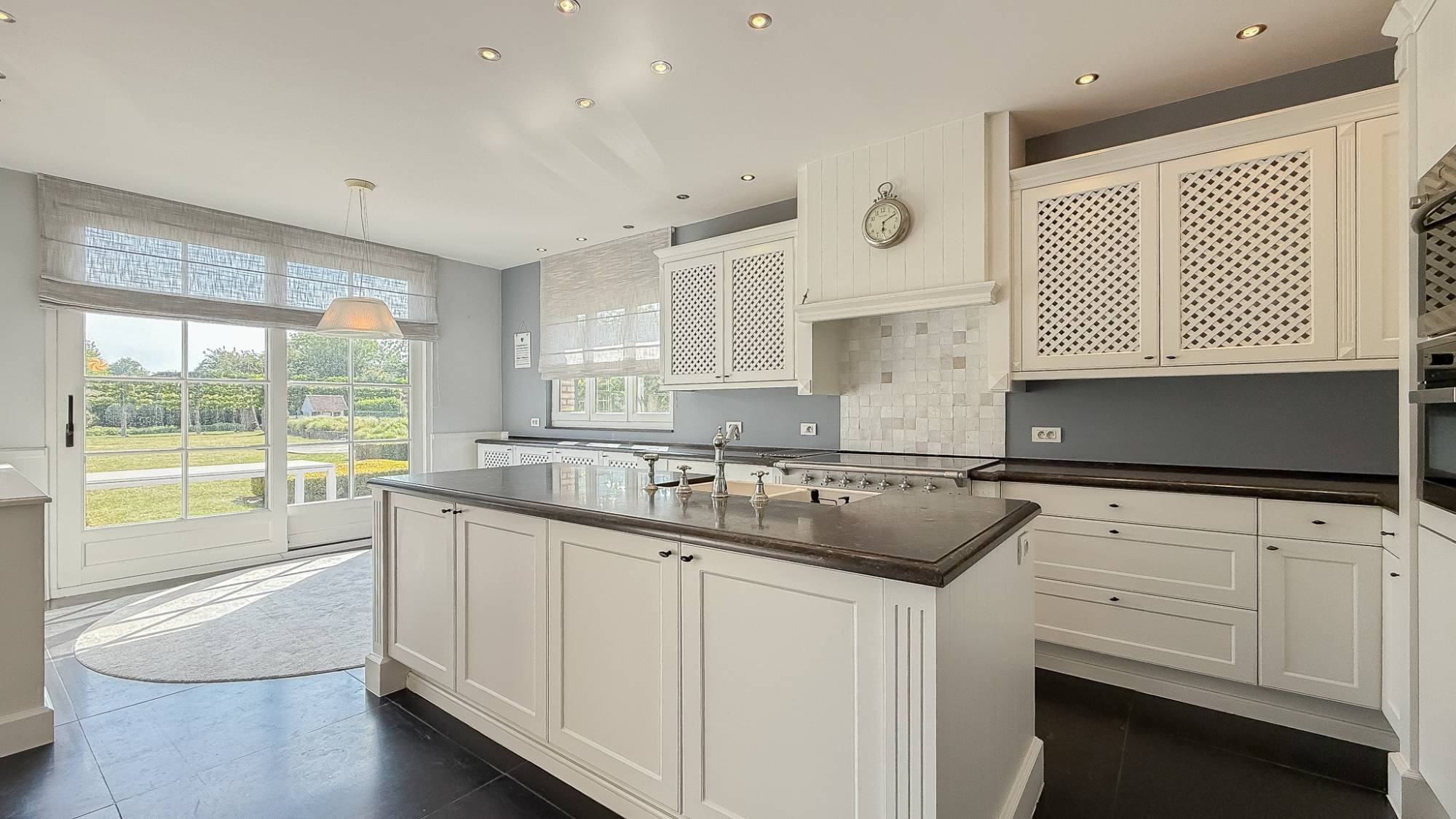 Indeling: U wordt verwelkomd in een royale inkomhal met vestiaire en gastentoilet. De elegante woonkamer met open haard sluit naadloos aan op de eetkamer, die uitkijkt op een prachtig aangelegde tuin. Verder is er een afzonderlijk bureel met open haard, een landelijke keuken met keukeneiland en gezellige ontbijthoek, en een praktische bijkeuken.